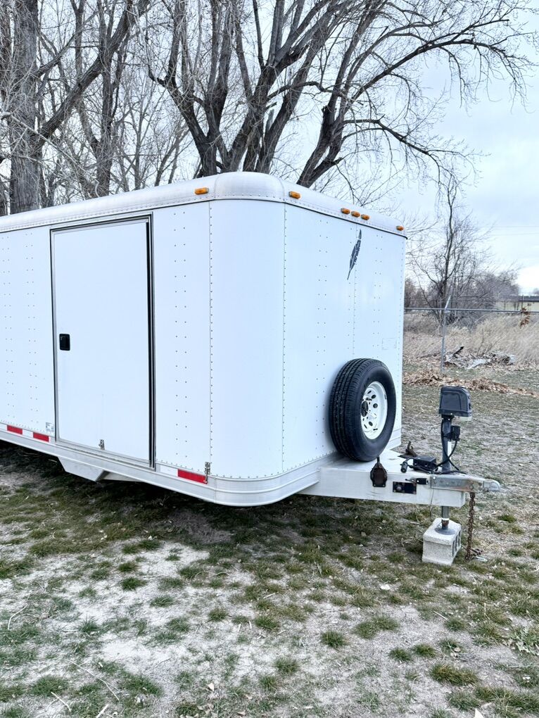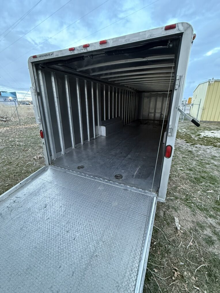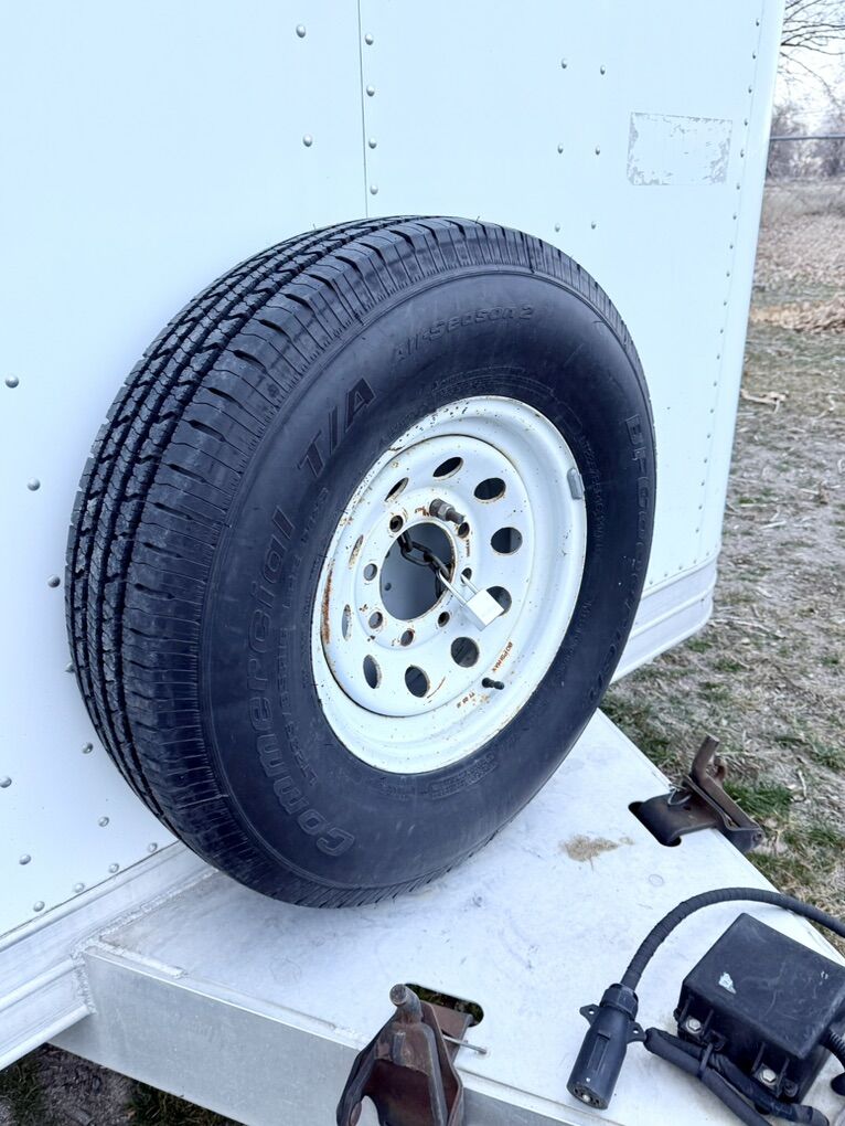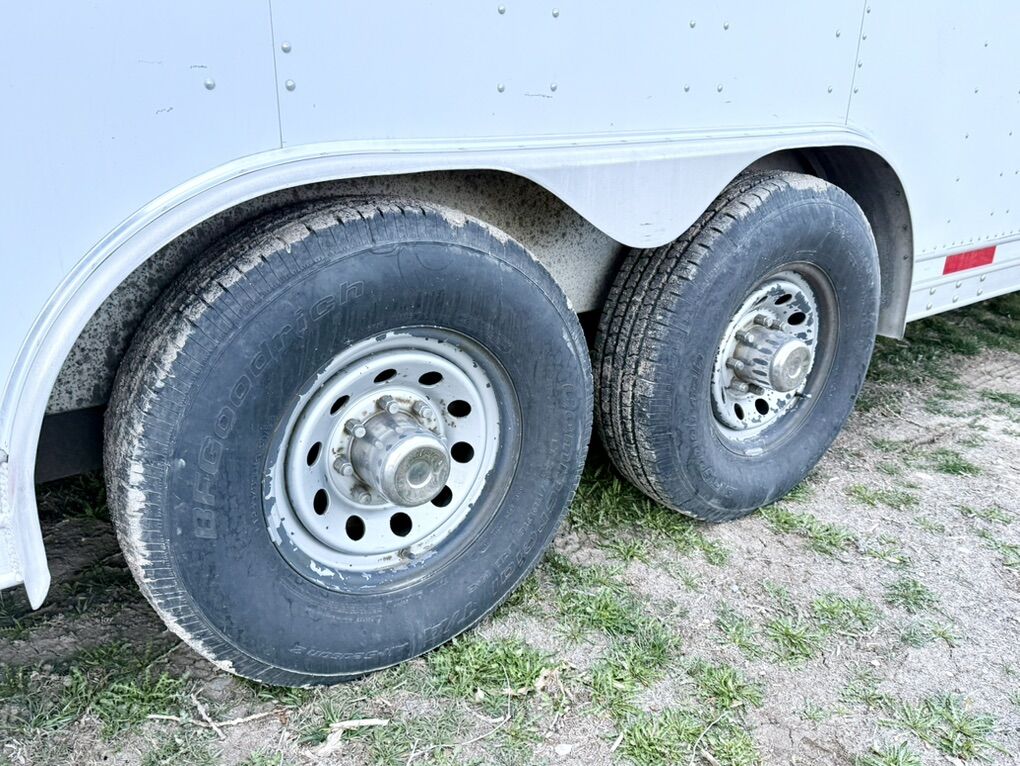 This trailer is all aluminum including the floor, which is hard to find in newer trailers. This trailer is built much better than most trailers you’ll find nowadays. It has two 5200lb Torsion axles with 8-lug hubs. Both axles have been gone over including repacking bearings and checking the brakes. The interior of the trailer is nice for its age. Has an extra large side door that makes getting larger items in and out a lot easier. Exterior of trailer is nice as well. It does have some damage to the roof, near the rear of trailer above ramp. A tree branch fell on it years ago and it was repaired correctly (please see photos). The ramp door pulls down and goes up like it should. It’s missing the extra fold down on the end of the ramp but it’s never made any difference with loading and unloading a vehicle. The wiring is in good shape. All the lights work on it expect for two of the marker lights. Has an electric jack but I have not used it. It has a manual option that I use instead. All (4) tires are BF Goodrich E-rated tires that are like new. Has a new matching spare tire that is mounted on the tongue. I have all the door keys for it including the lock for the spare tire.