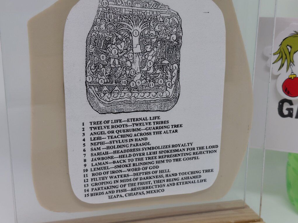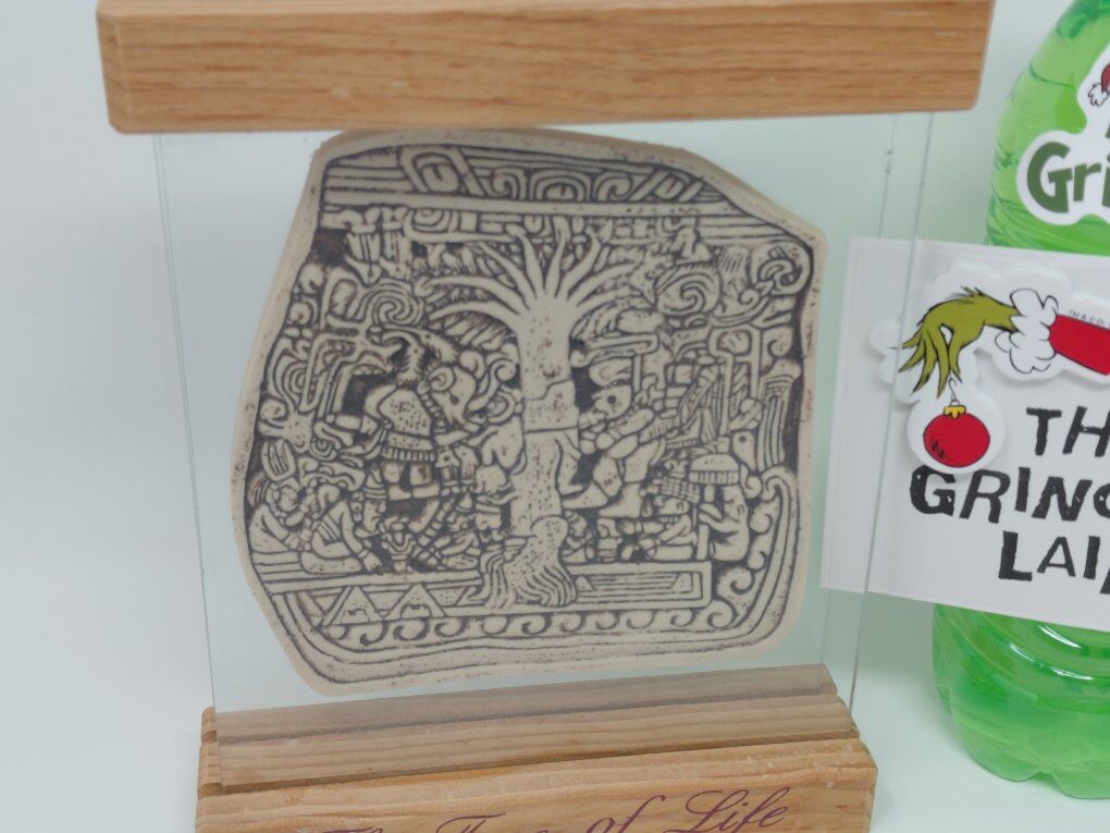 PayPalVintage Izapa Stela 5 Lehi's Dream Tree of Life Stone in Glass Display with Wood Trim. Wood has a few blemishes (see pictures).