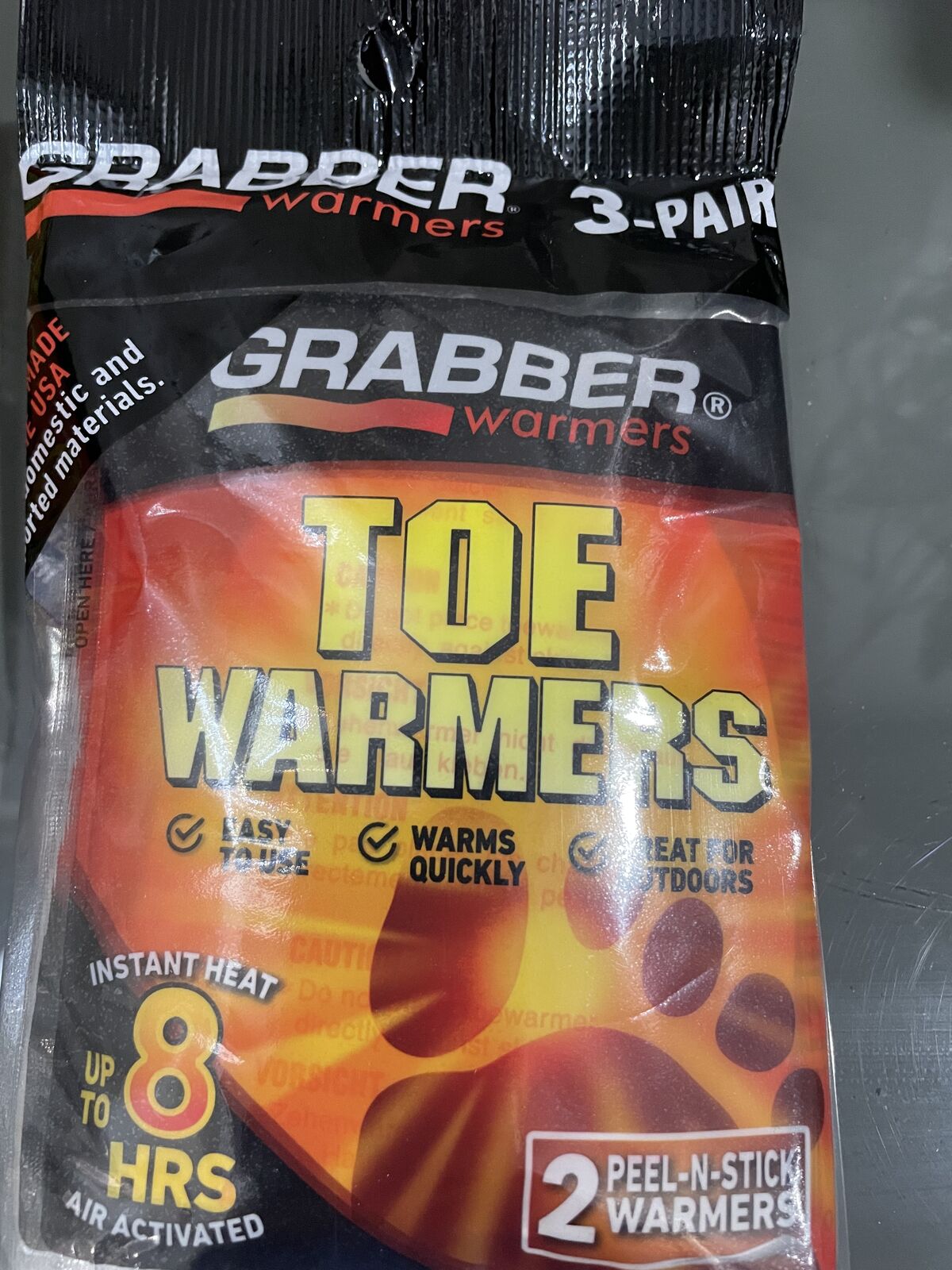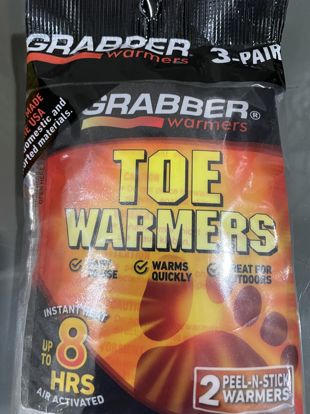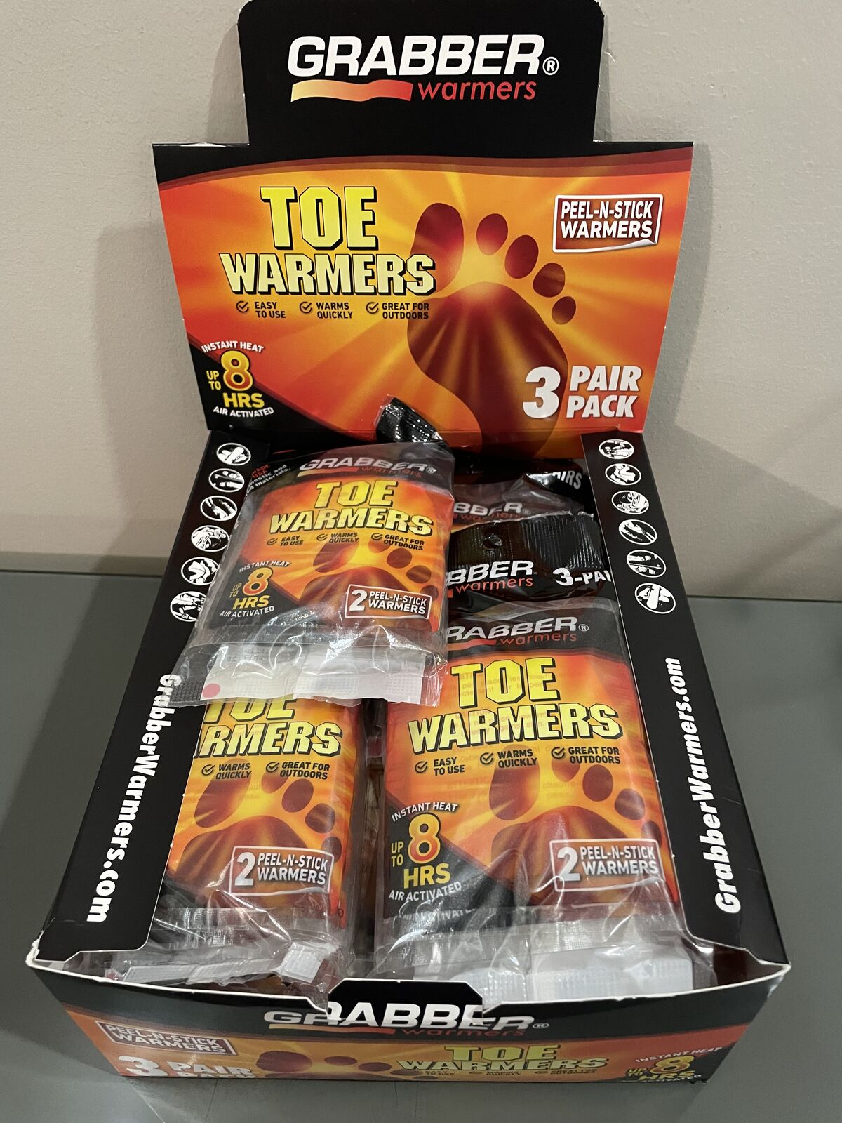 Toe Warmers are the perfect everyday solution for cold toes. Featuring a thin, unique rounded toe and adhesive backing, they are designed to function in the low oxygen environment of boots and shoes. Simply stick the warmers to the outside of your sock under your toes and enjoy up to 8 hours of warmth. Each box contains 20 packages per box; 3 warmers per package. All Grabber® Warmers are designed for one-time, disposable use. Up to 8 hours of warmth Warms quickly Easy to use and air activated Great for the Outdoors Adhesive backing sticks securely to the bottom of your sock while inside your shoe