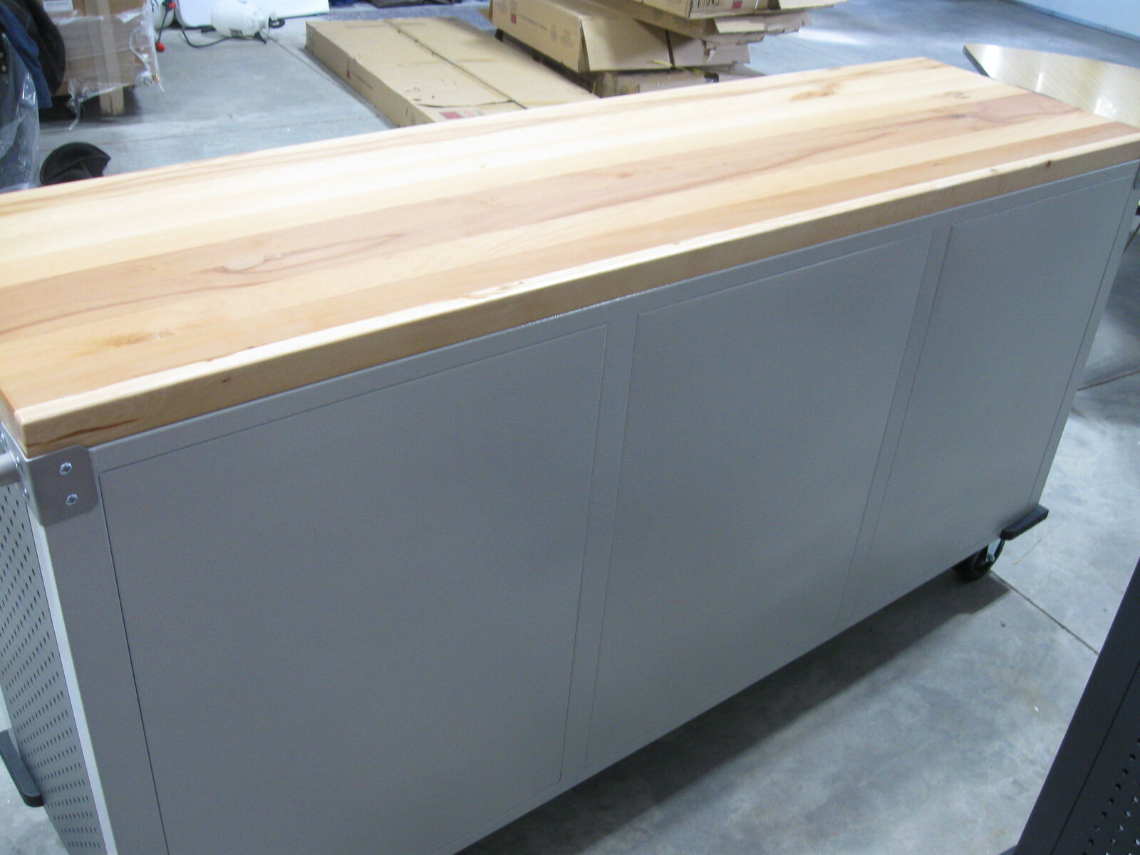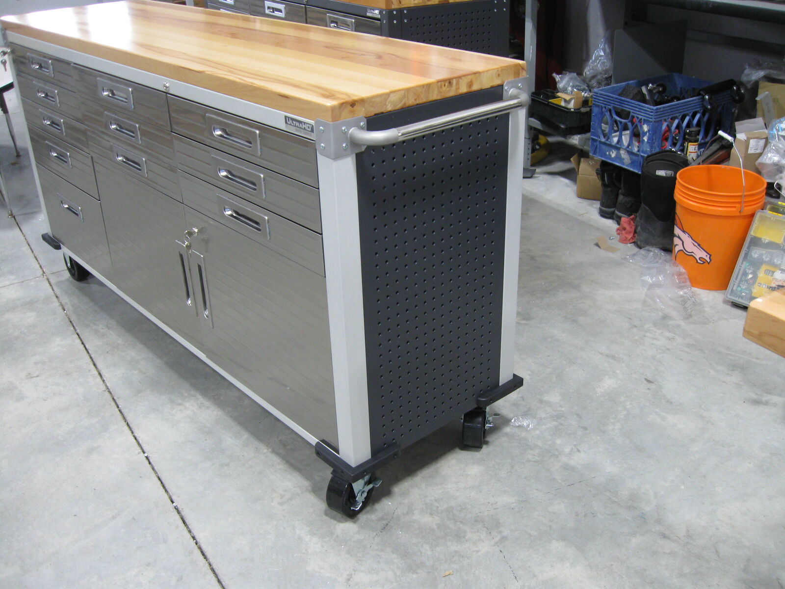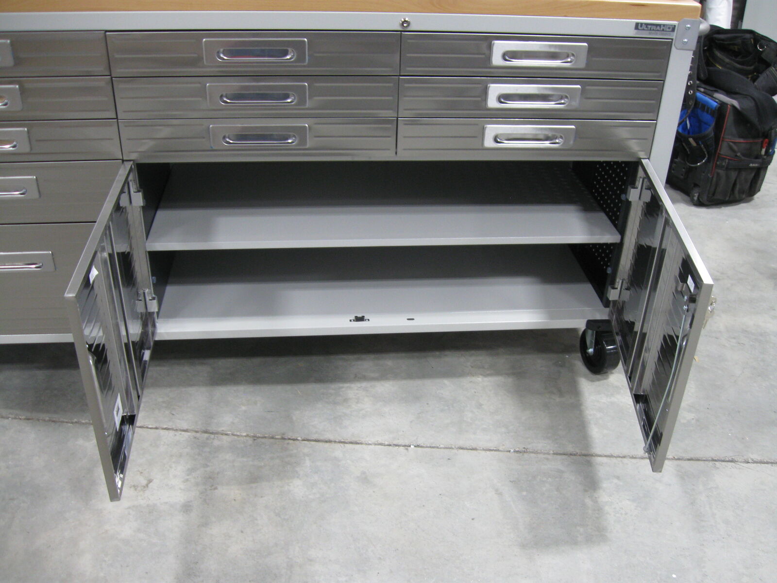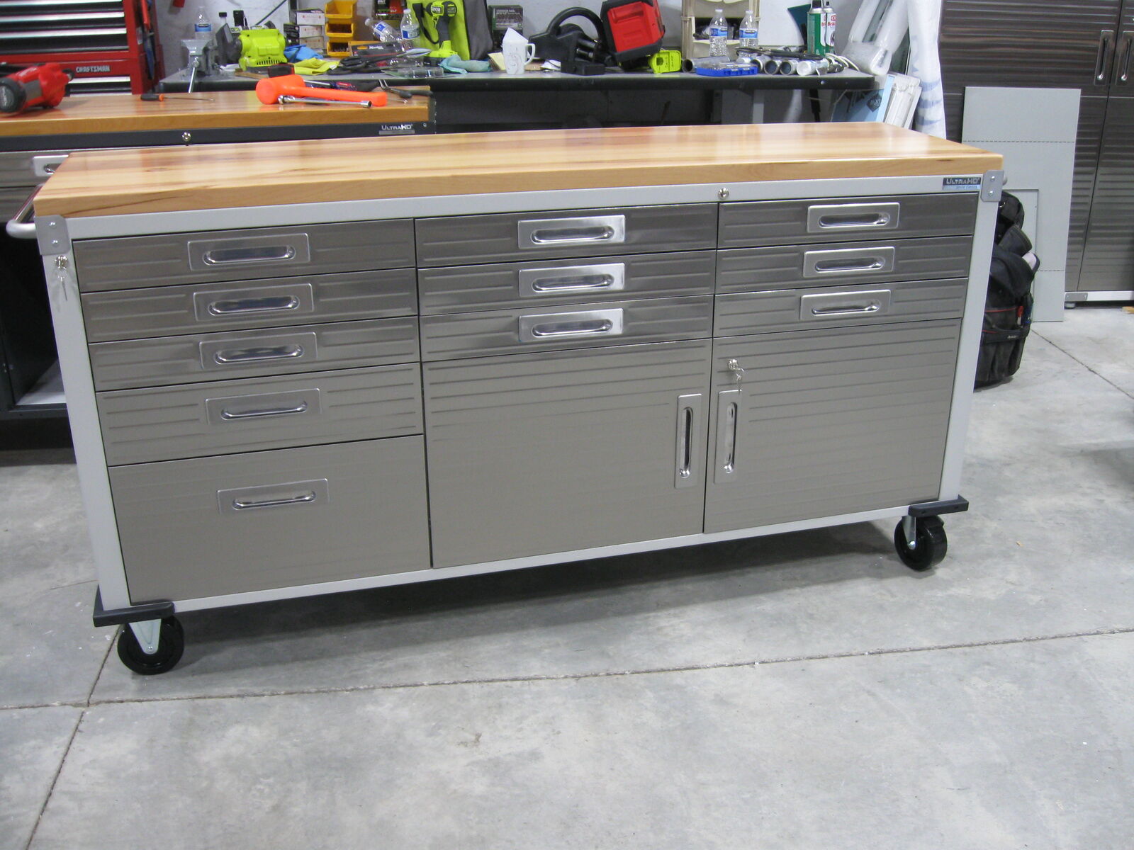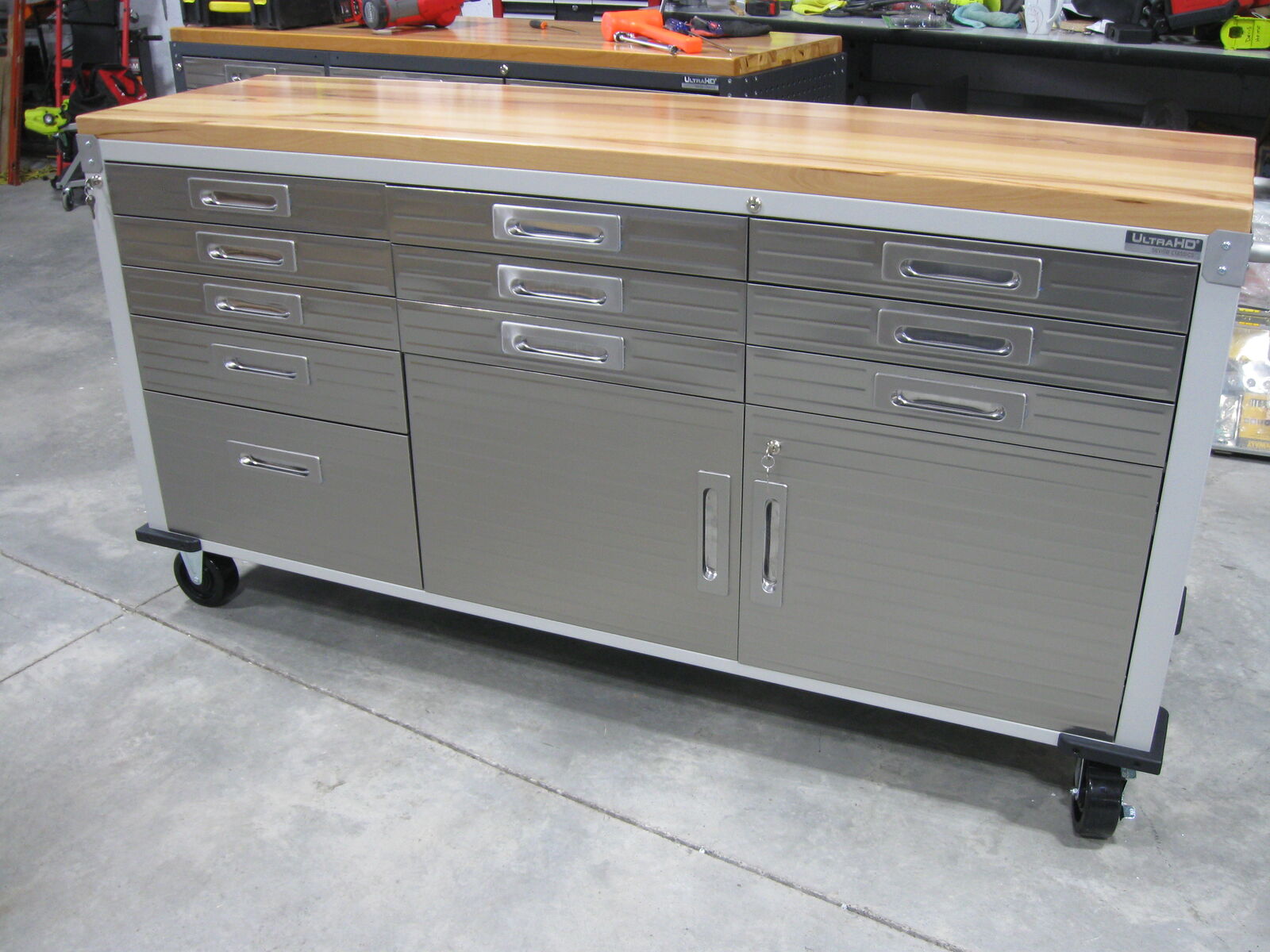Overall dimensions with push bars: 77" x 20" x 37.5"H Overall dimensions without push bars: 72" x 20" x 37.5"H One 11-drawer rolling workbench Total weight capacity evenly distributed, 500 lbs. Weight capacity per Drawer, 30 lbs. All-steel construction in powder coat finish provides industrial-strength storage UltraGuard fingerprint-resistant stainless-steel cabinet doors and drawer fronts Solid hardwood top: 72" x 20" x 1.5" thick Total of 11 drawers with liners 9 small drawers, 19.25" W x 18.5" D x 2.75" H 1 medium drawer, 19.25" W x 18.5" D x 4.75" H 1 large drawer, 19.25" W x 18.5" D x 10.75" H Piano hinged 2-door cabinet Cabinet includes a full-width shelf at 3 adjustable height positions All storage compartments are fully lockable (2 keys included) Stainless-steel push bar on each side 4 corner bumpers for protection 5" heavy-duty wheels (2 locking) Net weight: 250 lbs.