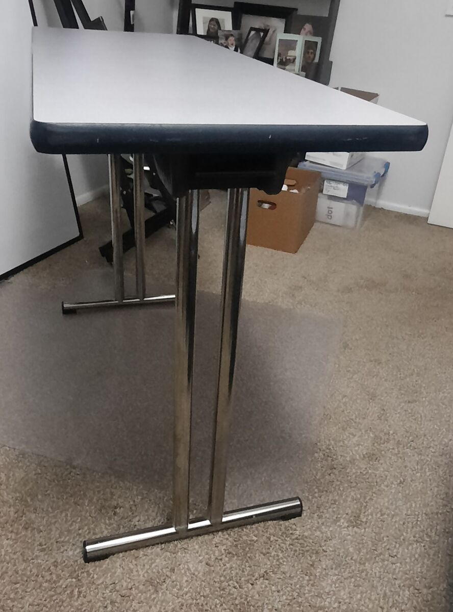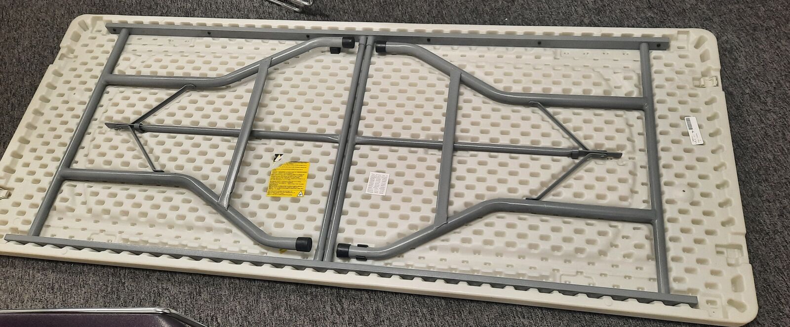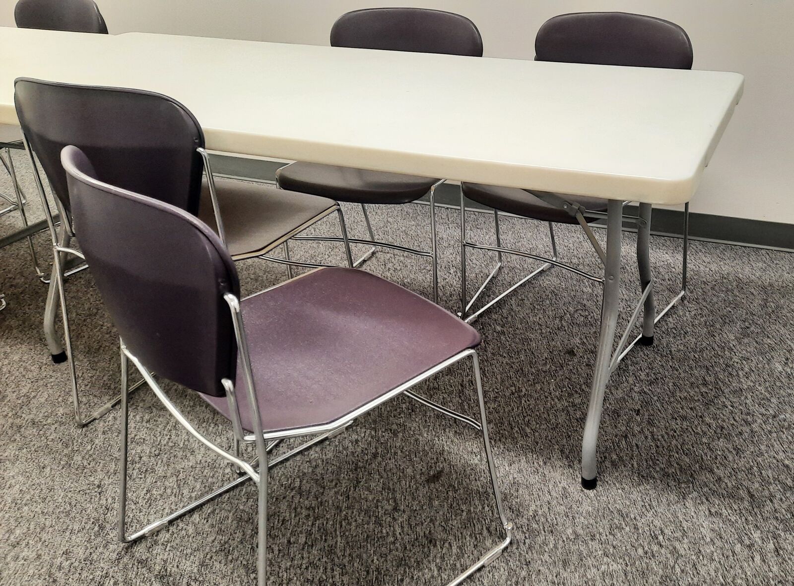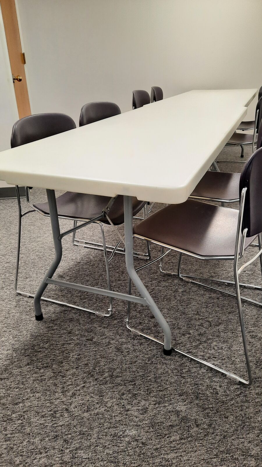 ZelleTWO 6 ft TAbles / one small side table / 10 office quality stackable chairs/ very clean and sturdy / steel leg chairs. Used in an office / Perfect for events or family parties. Take all items ( 2 big tables, 1 small table and 10 chairs ) for one price! Or take some - negotiable