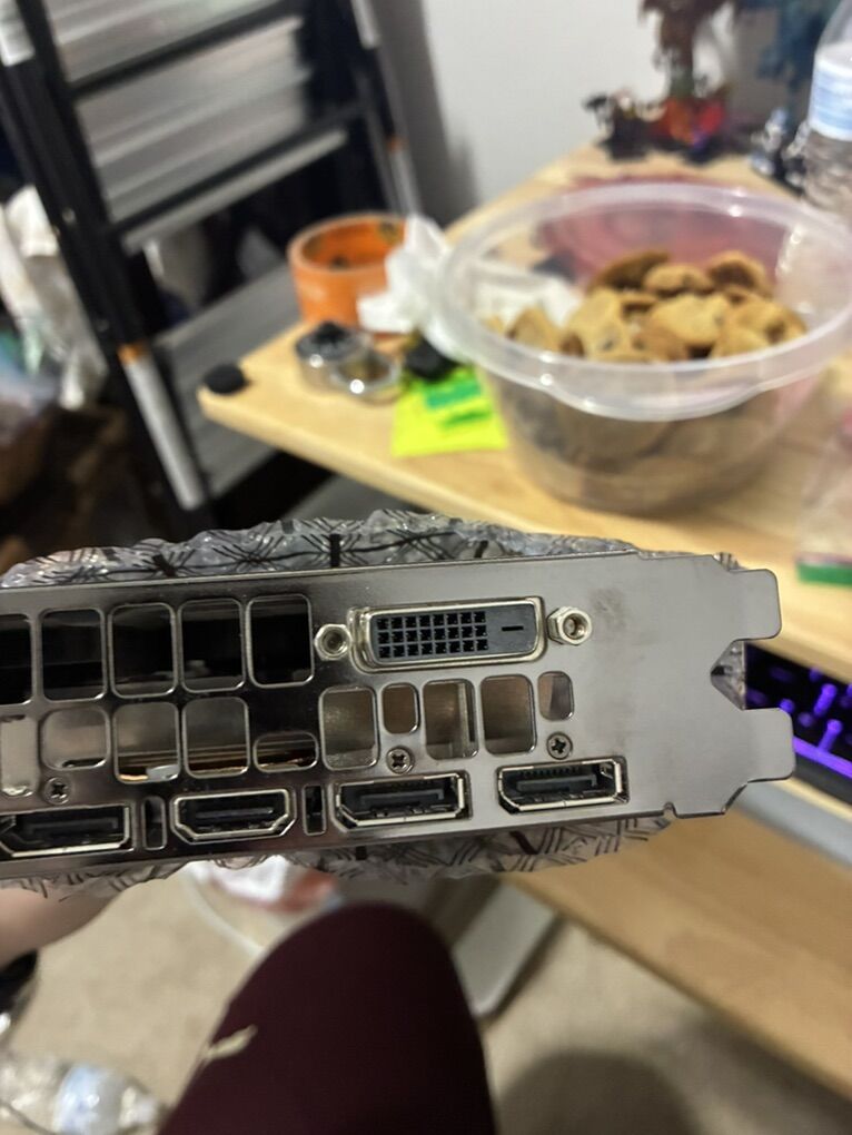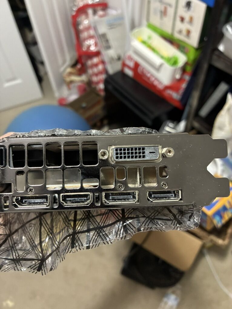 ApplePayEVGA GeForce GTX 1070 graphics card for a PC. It has 3 DisplayPort slots, 1 HDMI port, and one DVI port.
