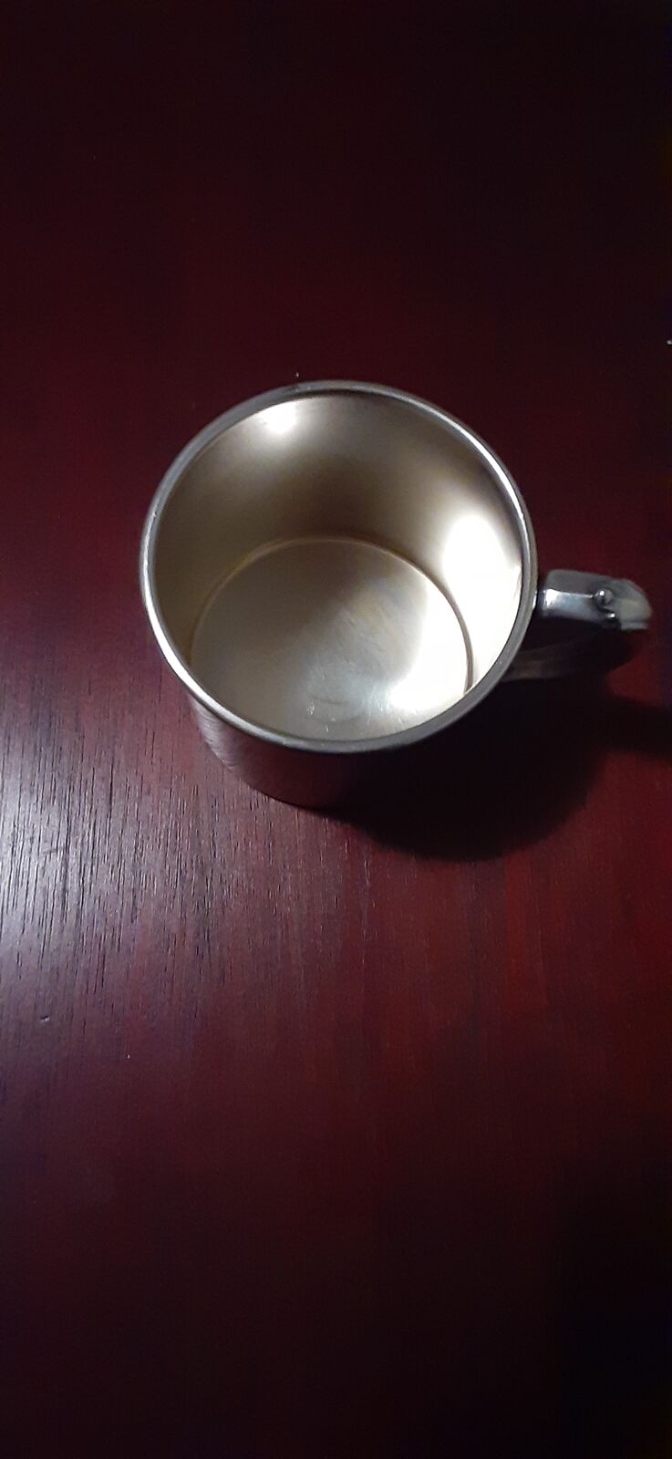 Measures approximately 2.25 inches high. Simple, classic design with a smooth rolled rim and curved handle.