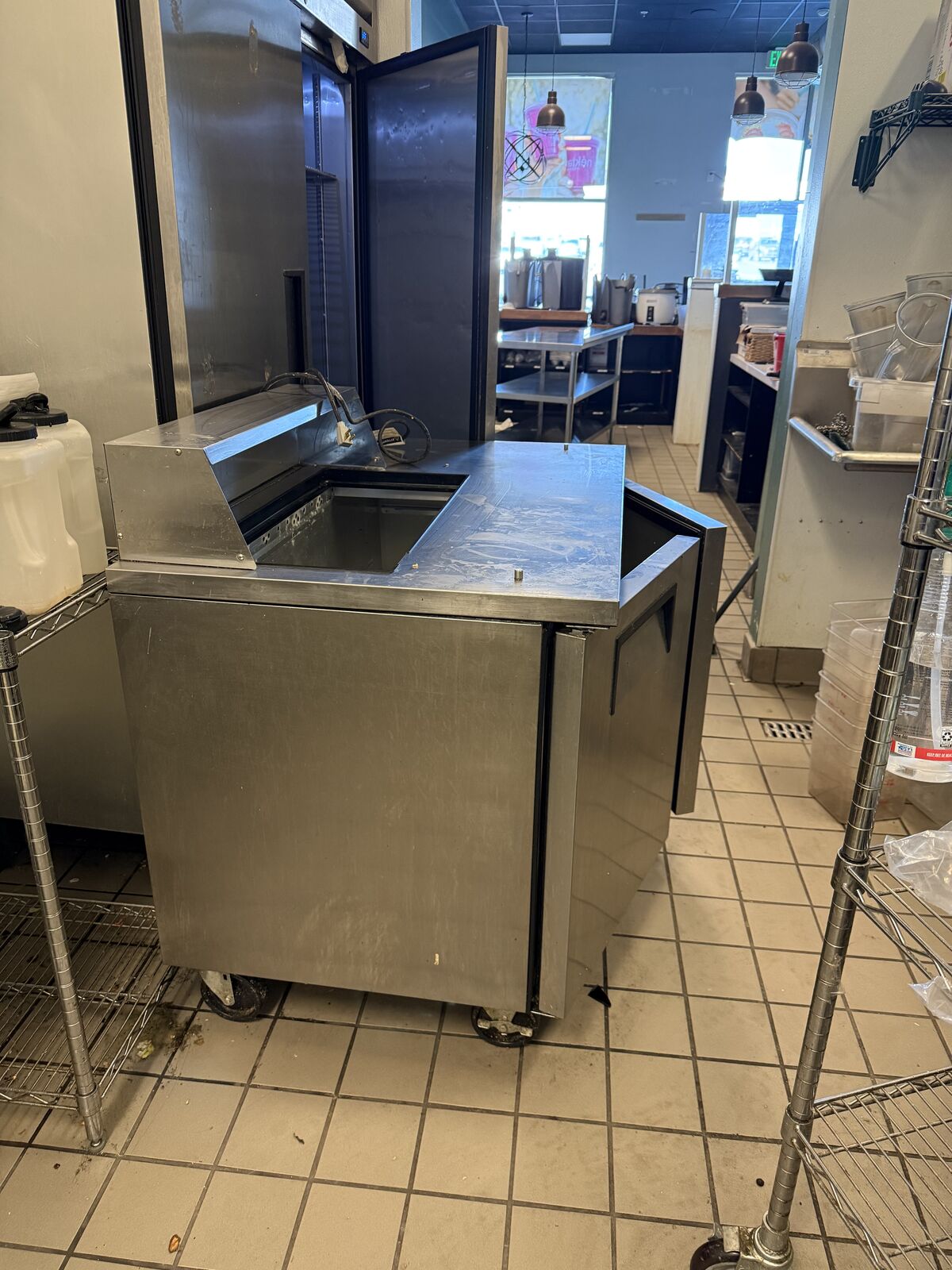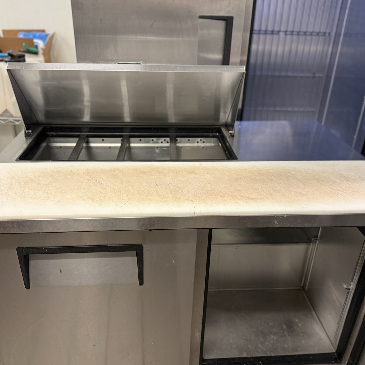 VenmoIn good condition. Might want to replace the cutting board (not shown but included). The food prep station features a stainless steel front, sides, and back to promote lasting durability and corrosion resistance; the backing is paired with a GalFan coating to further enhance corrosion resistance. The flooring and insulated liner are made of stainless steel as well, and the corners are coved, all of which help facilitate cleaning. Additionally, this table comes with an insulated stainless steel cover that helps keep cold temperatures in and contaminants out.