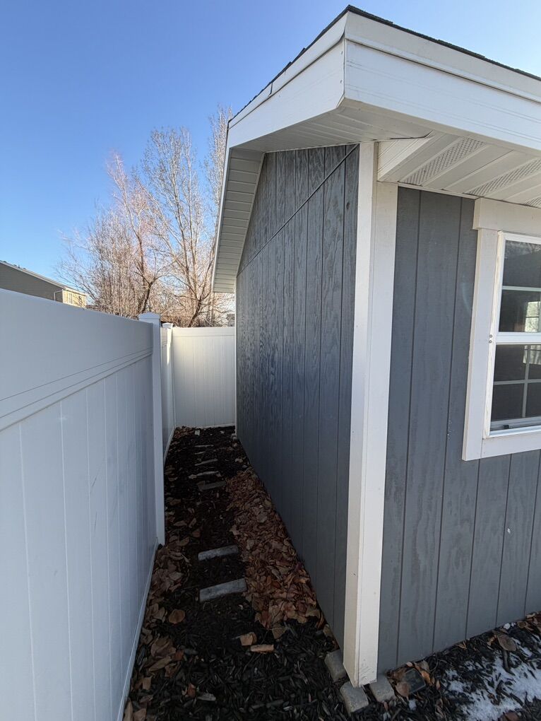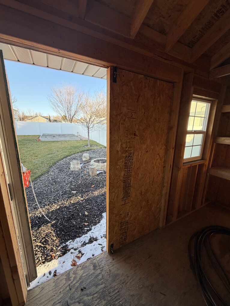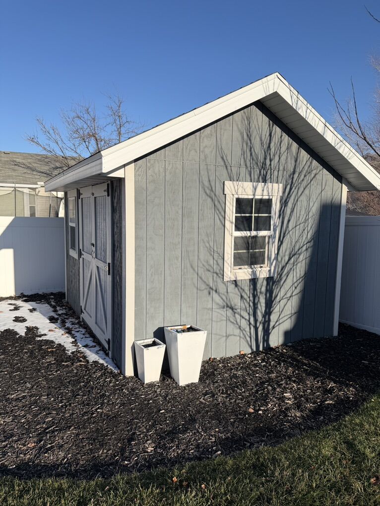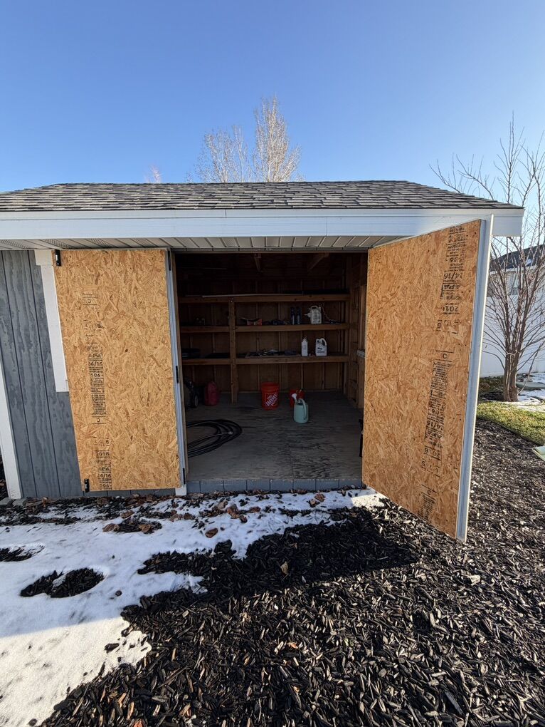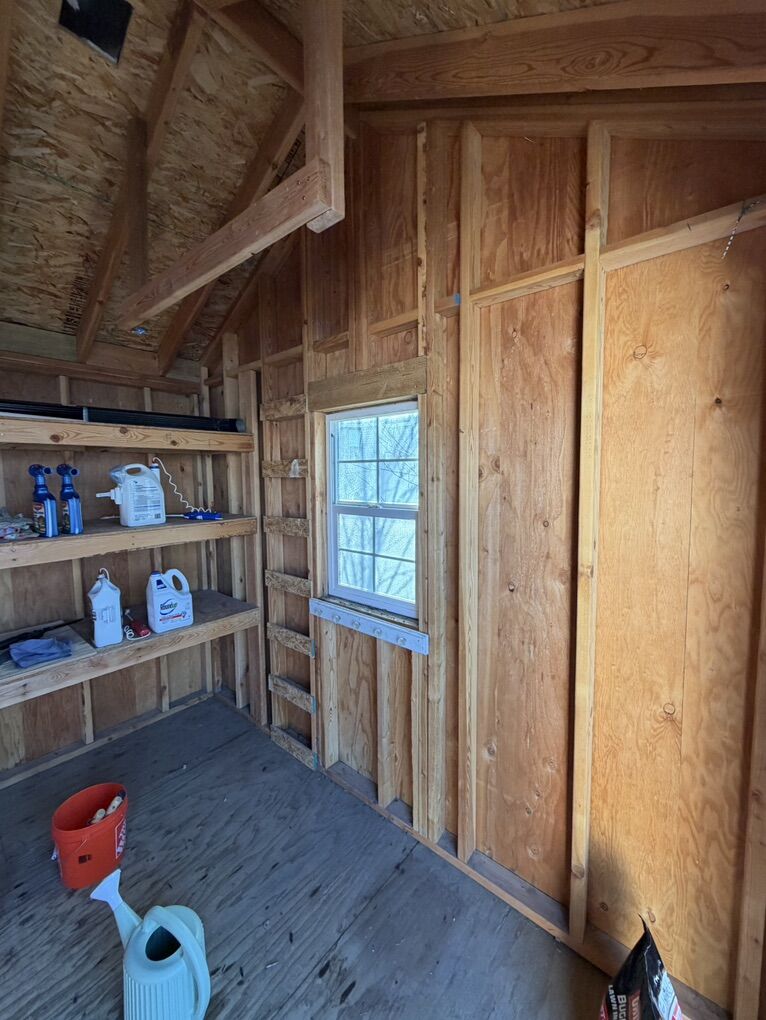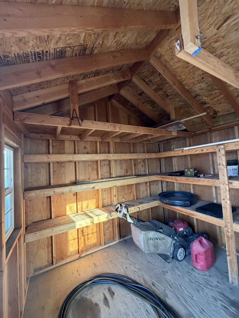 Custom built by my husband who is a licensed general contractor. 2x4 framing. The base is 2x6 pressure treated framing and pressure treated decking sitting on blocks. Architectural shingle roof with aluminum soffit and fascia and 2-2’x3’ operable windows for light and ventilation. Size of shed =12’ 2 1/2” on door side x 10’ 2 1/2”. Door: double door, opening width is 5’3” total shed height is approximately 10’. The shelving on the back wall is 24” deep and the shelving on the side wall is 13” deep. There is a small loft that measures 2’7” deep x 10’ wide **You will need to arrange for removal of shed via crane and flatbed trailer. Price is already discounted to reflect this additional cost for relocation.