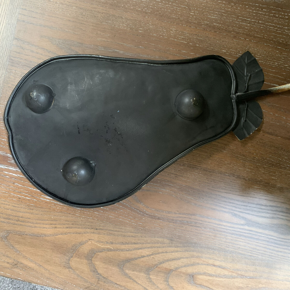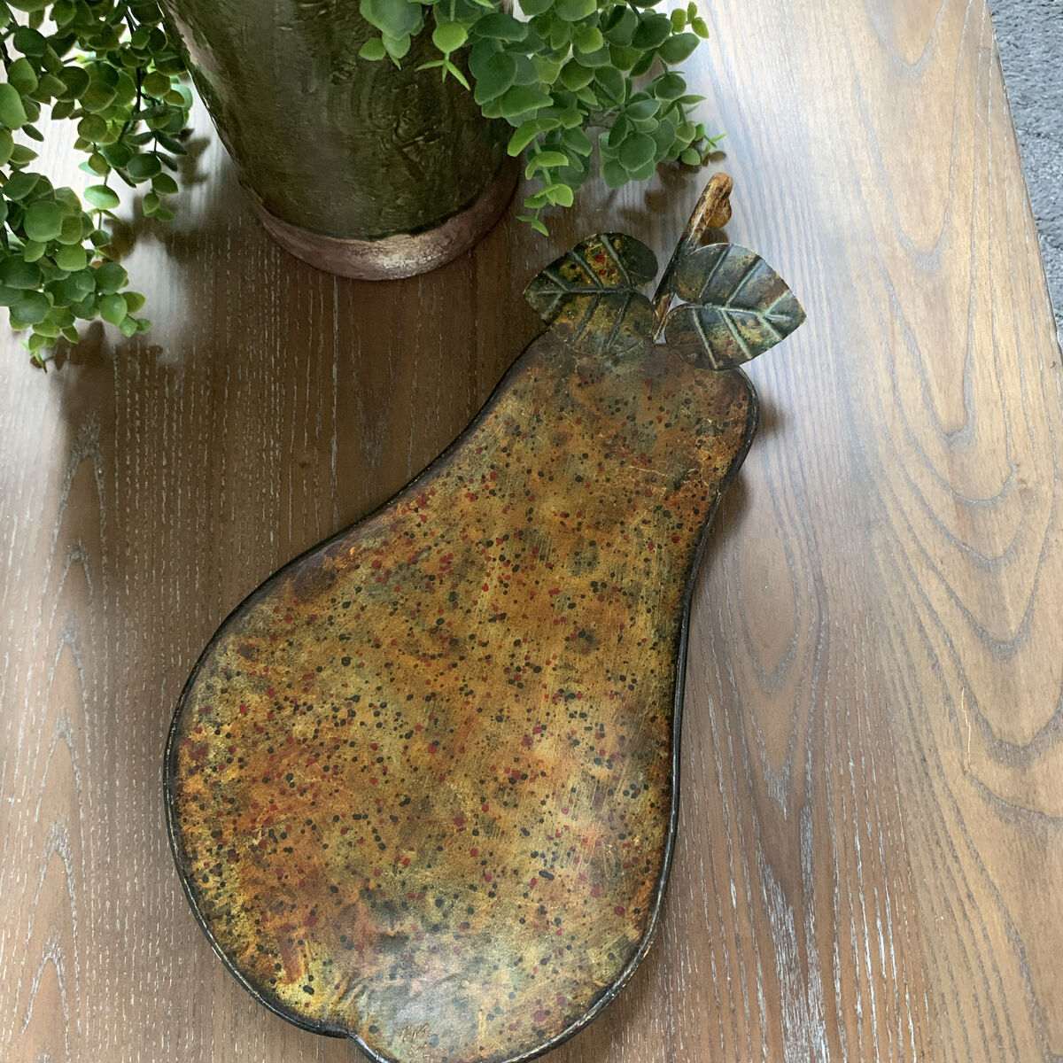 VenmoLarge metal tray 17”L x 8.75”W x1.5”H. It is a beautiful curved pear shape, with leaves and a stem. It is elevated by 3 metal feet. Beautiful rustic earthtone color palette. Clean and ready to go. Non-smoking/No pet home