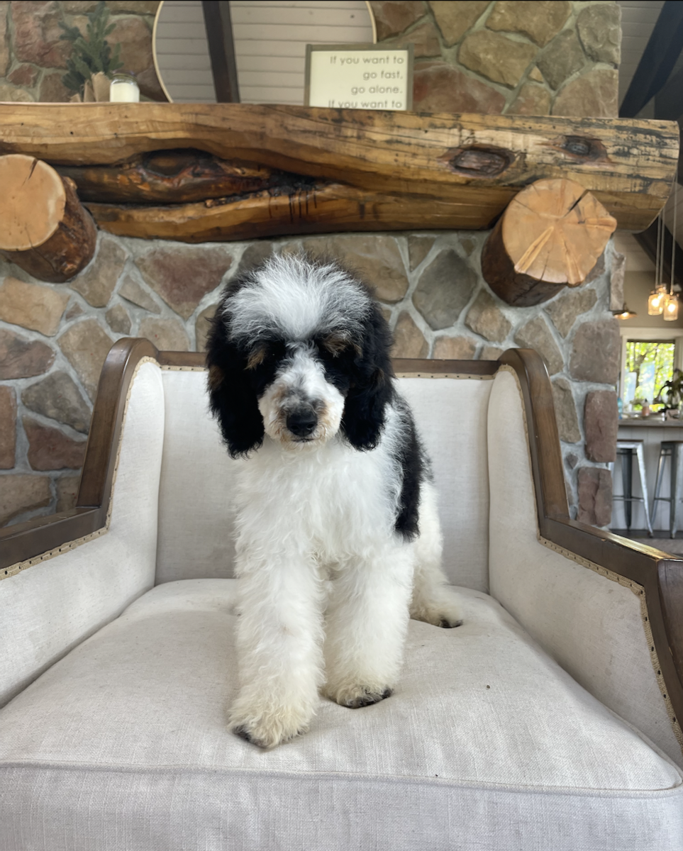 He’s wonderful with children, other dogs, and even cats. He thrives in a home where he’s included and engaged. Like many smart poodles, he can have a playful, slightly sassy streak — occasionally playing “keep away” when it’s time to go to bed for the night in his crate — but it’s all part of his charming personality.