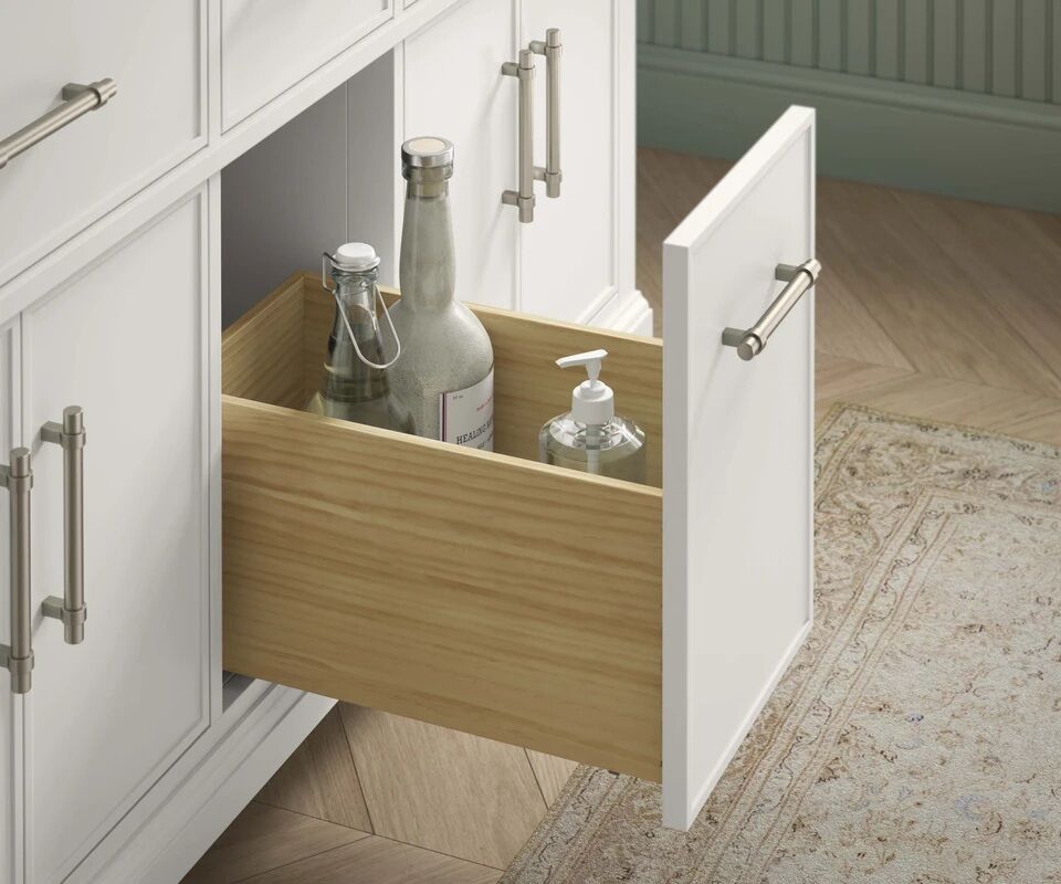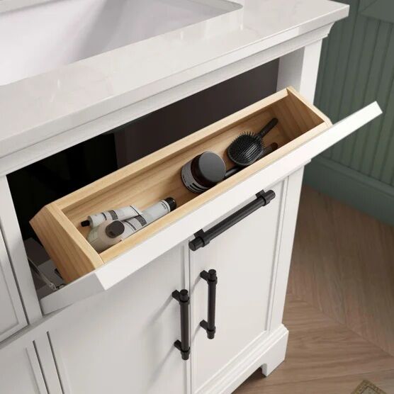 Polished and stately, the Chulton 60" vanity set can truly be considered a piece of bathroom furniture. Its traditional design breathes a quiet elegance into your bathroom while providing you with ample storage to keep your bathroom organized and clutter-free. The Chulton vanity set includes an elegant Bianca Bella quartz countertop and matching backsplash, two sinks, and two sets of cabinet pulls — in both Matte Black and Brushed Nickel finishes — so you can accessorize your vanity to best match your decor.