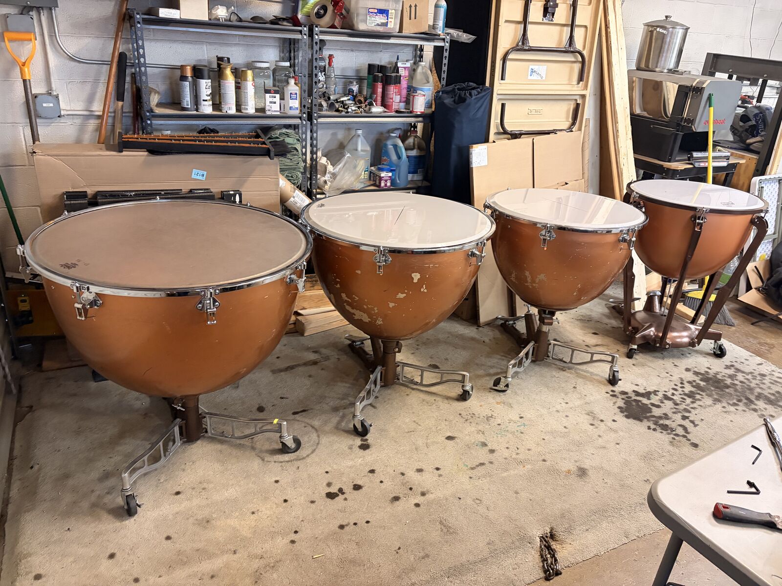 This set of timpani are all extended collar standard sized 32” 29” 26” 23”. The bottom three are older Universal models and the top drum is a post 2000’s Standard fiberglass. I have gone through and done basic repairs and tune up except for the bear edges. If you would like to have new heads install shoot me a message. The universal drum legs have been bolted together so they don’t fall apart easily, but can be converted back. There are brake calibers on all the drums and they are working. The heads are very old and need to be replaced as well as new bearing edge tape or Teflon spray. The finish on the bowls on the Universal drums are starting to peel and crack, but there are no holes. The top drum is in excellent condition besides needing a new head.