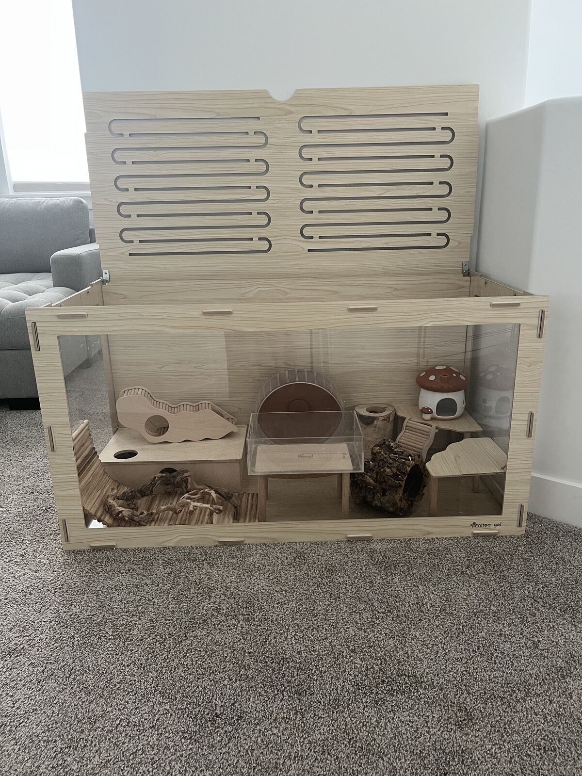 VenmoThis giant pet enclosure comes with all accessories shown, most of them are Nightangel brand. Dimensions are 47.2"L x 19.7"W x 23.6"H. There is some slight wear (mostly on the multichamber house) but overall in good condition. Also included but not shown in the picture is some bedding, food and water bowls, poop scooper, and a playpen.