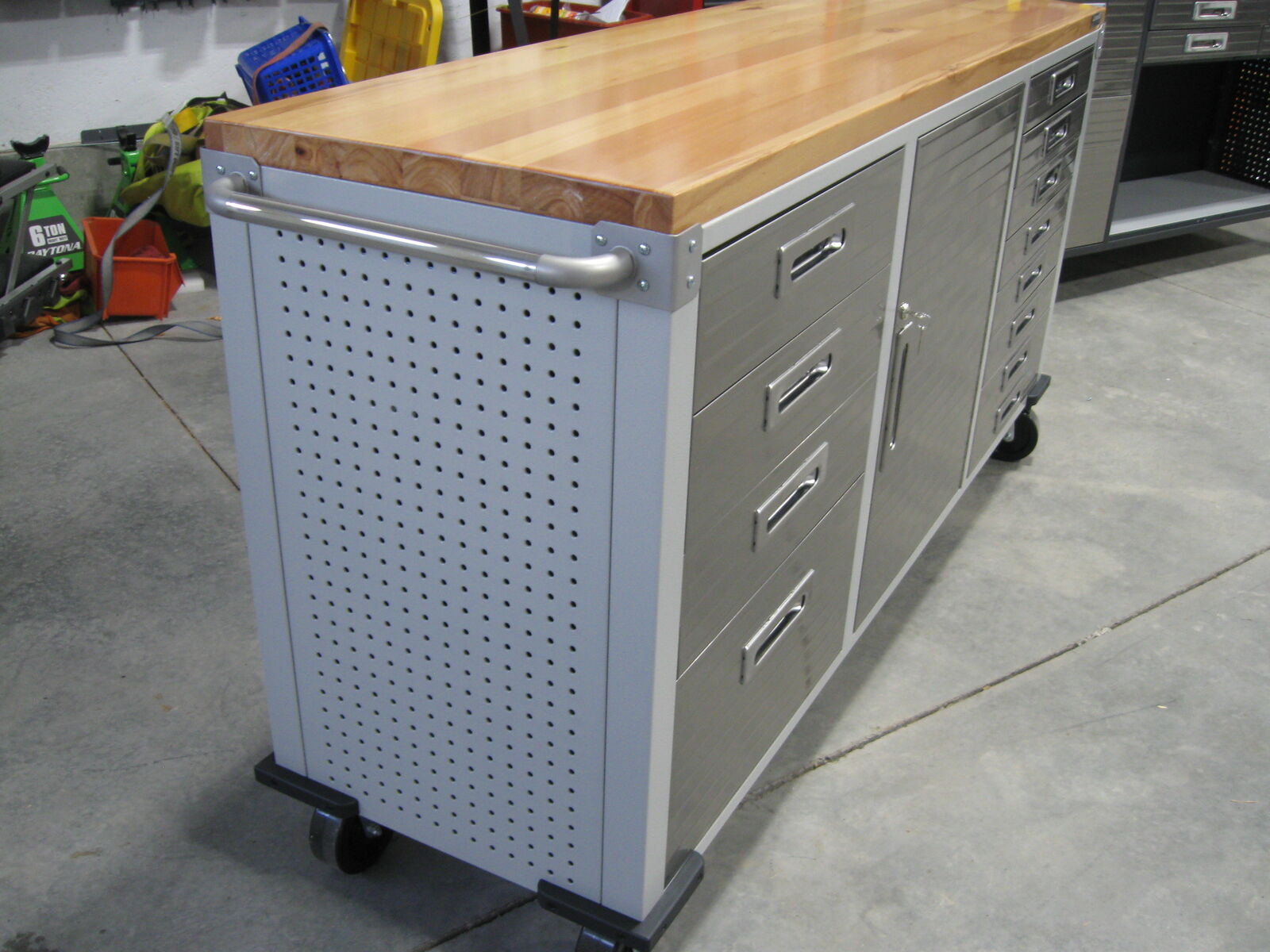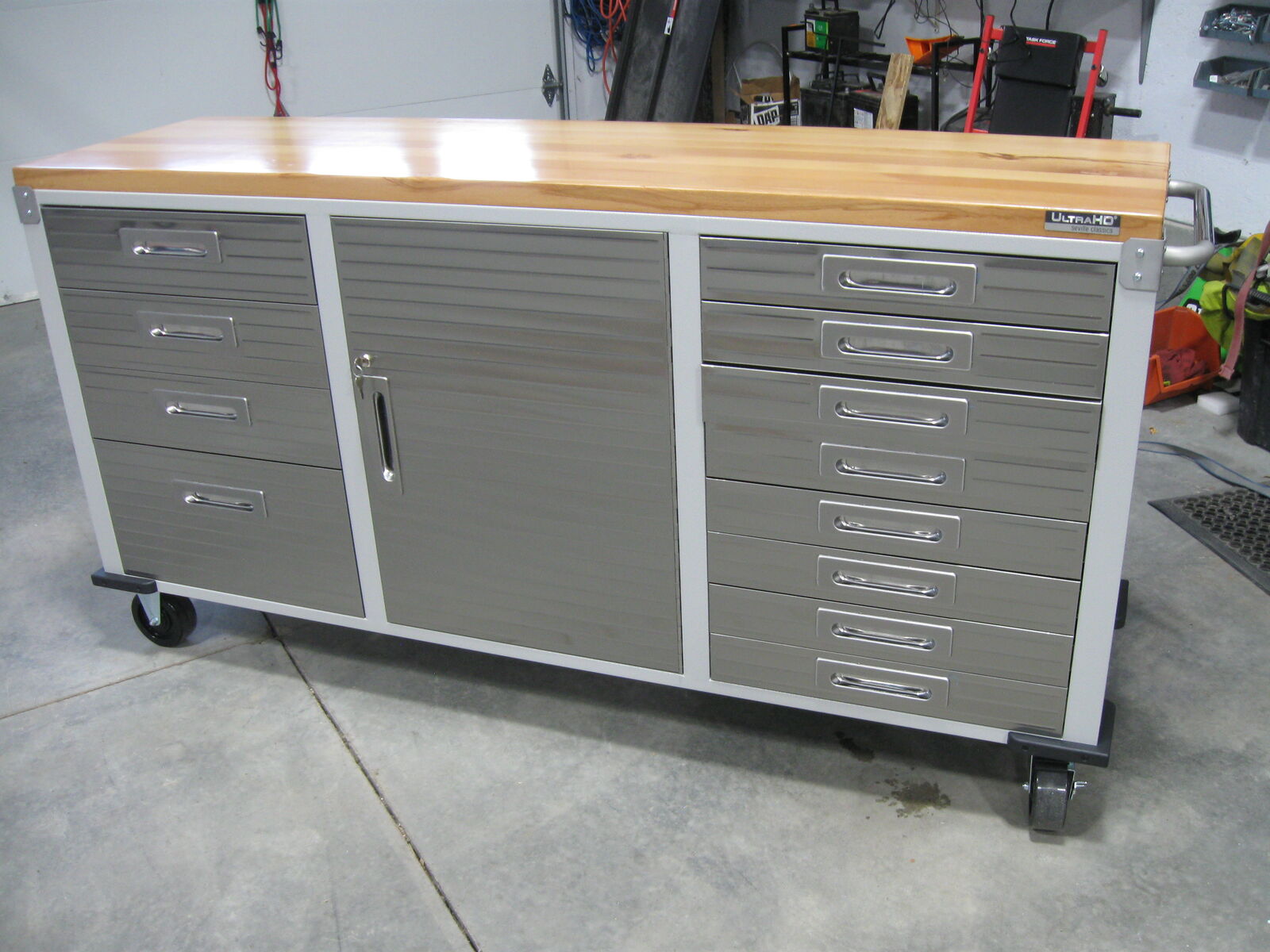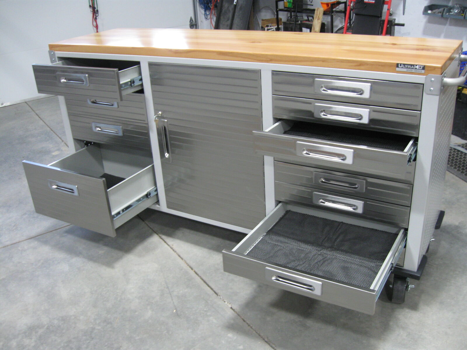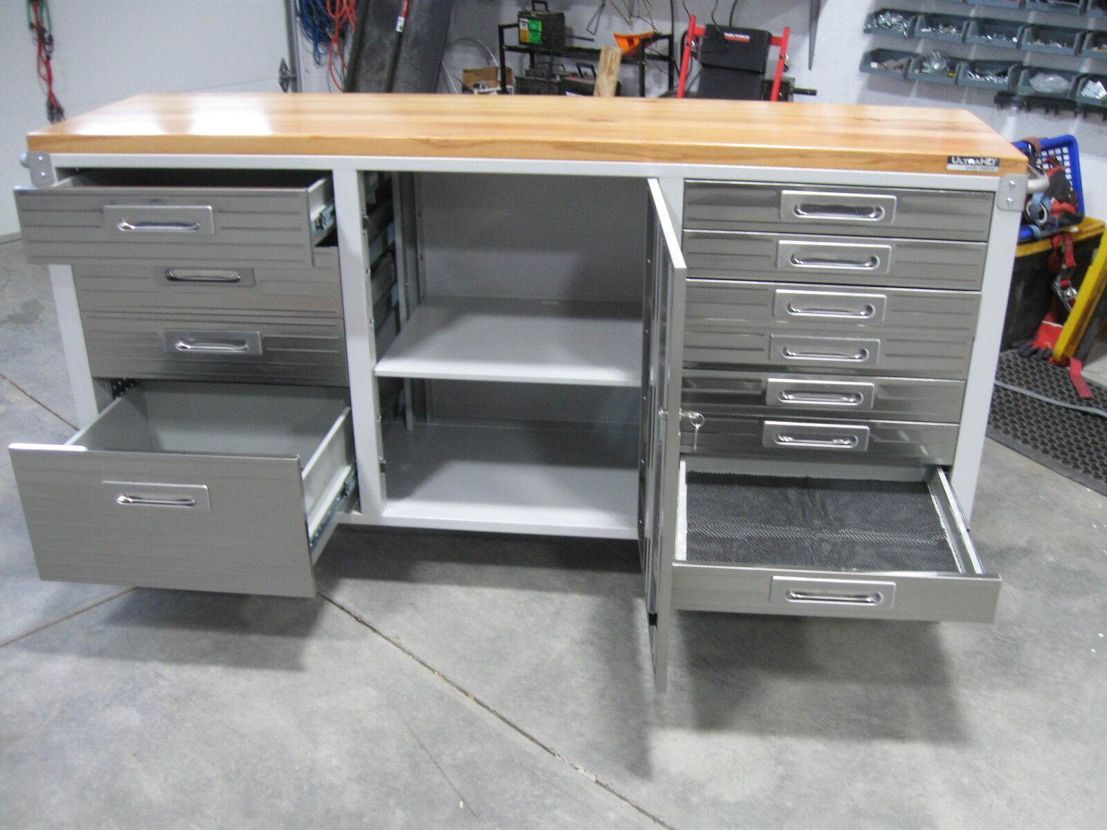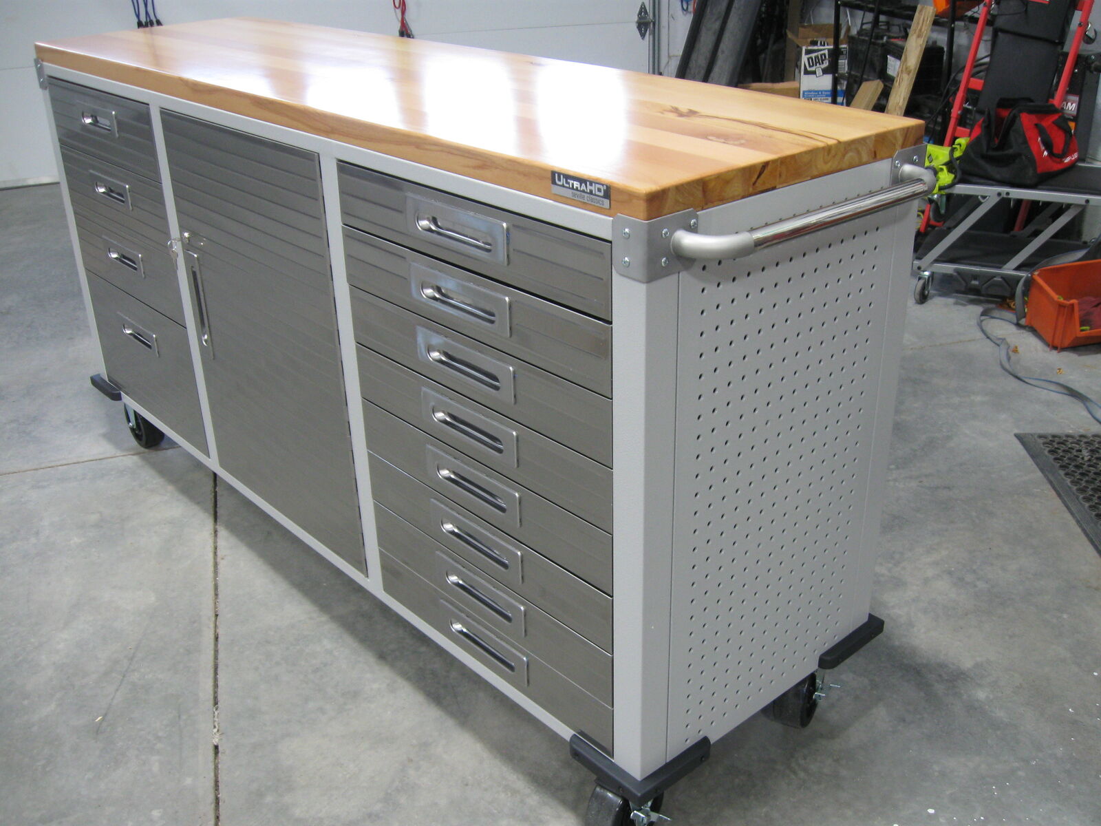 Specifications Overall dimensions with push bars: 77" x 20" x 37.5"HOverall dimensions without push bars: 72" x 20" x 37.5"HSolid hardwood top: 72" x 20" x 1.5" thickAll-steel construction provides industrial-strength storageUltraGuard fingerprint-resistant stainless-steel cabinet doors and drawer frontsAll storage compartments are fully lockable (2 keys included)Cabinet with full-width shelf at 4 adjustable height positionsTotal of 12 drawers with liners8 small drawers, 19.25" W x 18.5" D x 2.75" H3 medium drawer, 19.25" W x 18.5" D x 4.75" H1 large drawer, 19.25" W x 18.5" D x 10.75" HStainless-steel push bar on each side4 corner bumpers for protectionHeavy-duty commercial5" heavy-duty wheels (2 locking)Powder coat finish bodyTotal weight capacity evenly distributed, 1000 lbs.Weight capacity per Drawer, 30 lbs.