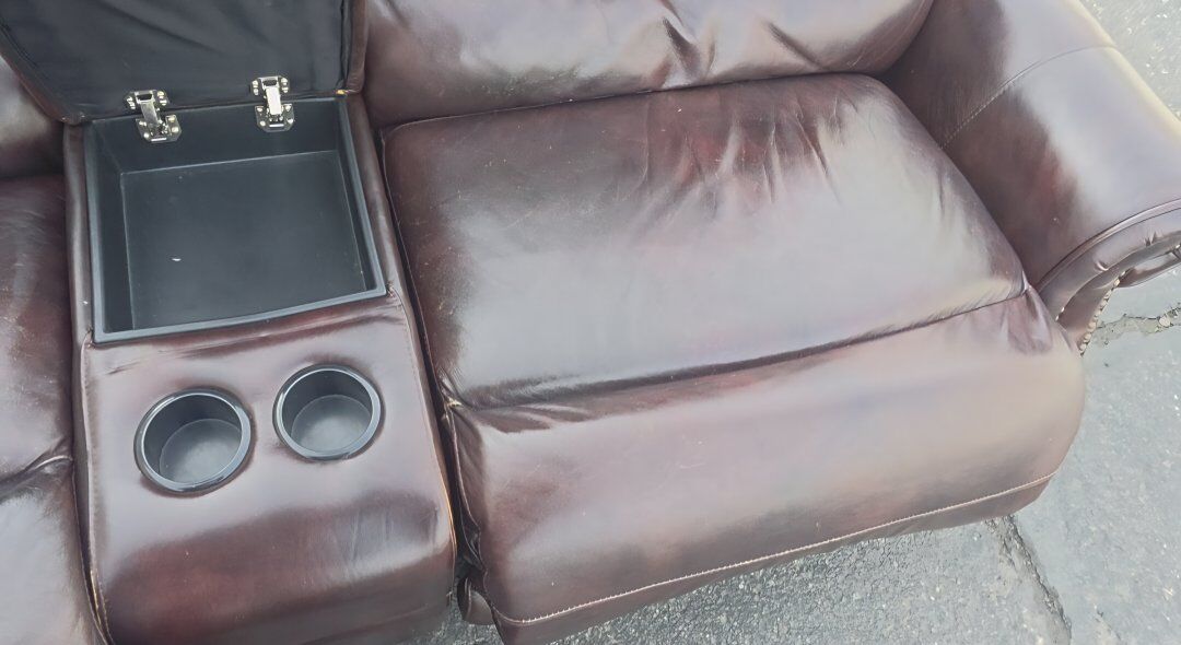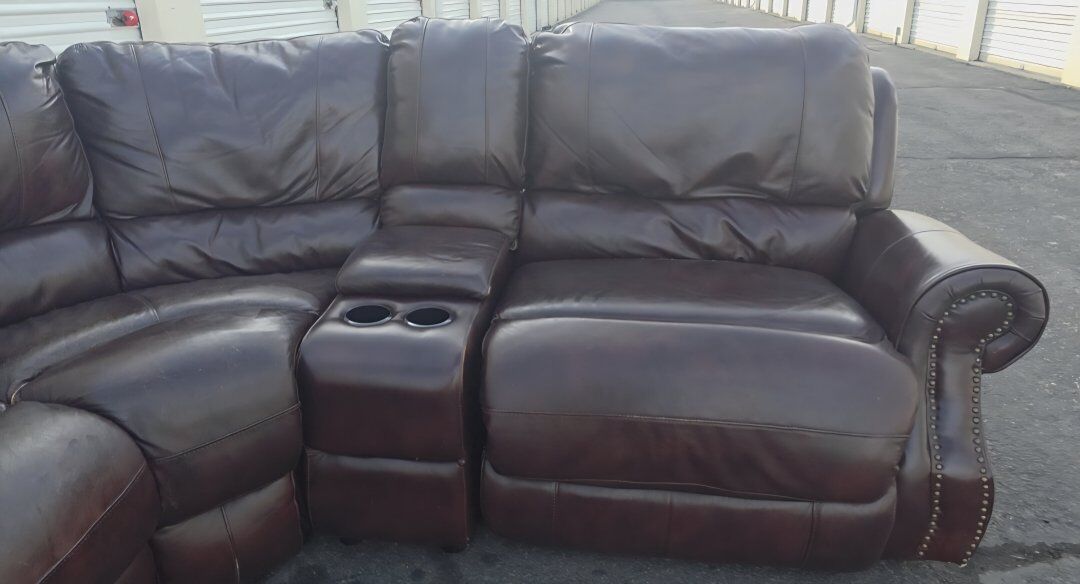 Beautifal 5-Piece leather sectional in great condition. Dark Brown. No rips or tears. Made of REAL LEATHER. This sectional is very comfortable and would be great in a living room or basement. Can be configured in a variety of ways to fit your space. Features 3 recliners (2 electric, 1 manual) which all work perfectly. Also has a cup holders/storage console, which can be placed anywhere you'd like. Comes from a pet/smoke free home. For dimensions, see last picture