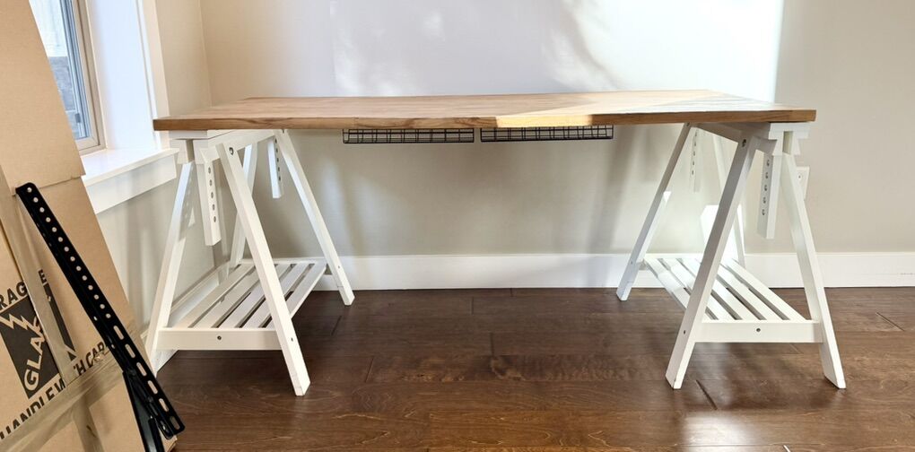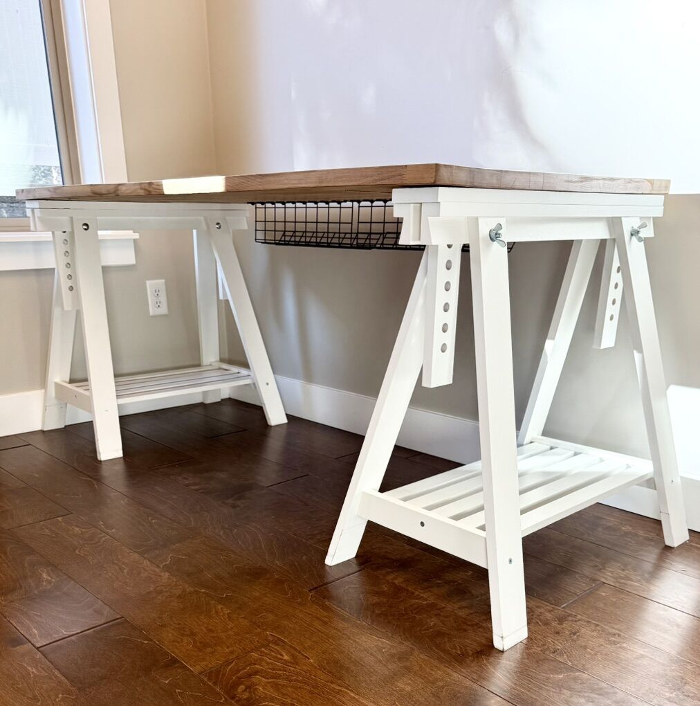 IKEA desk with solid wood butcher block top and adjustable white trestle legs. Very sturdy and great for a home office or student setup.