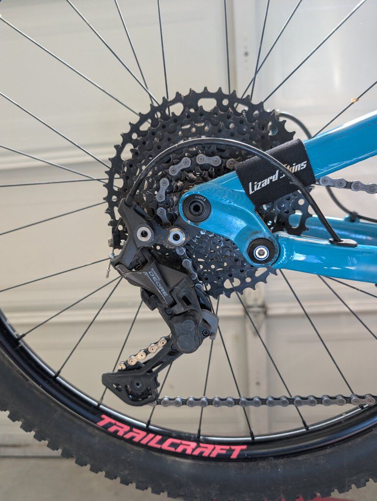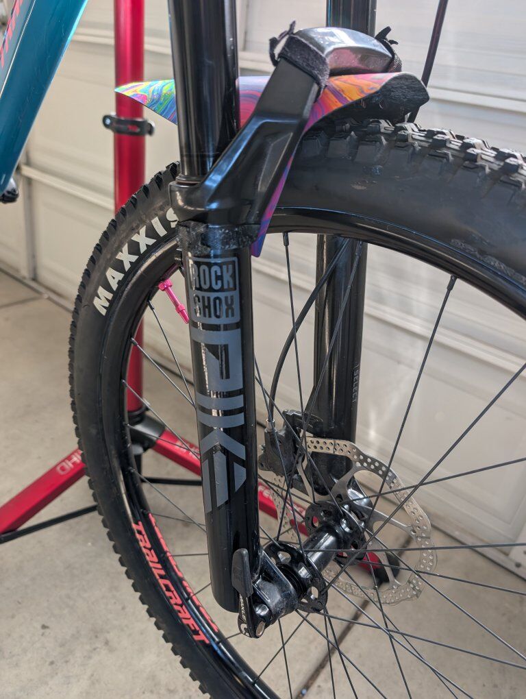 Build Highlights MODEL: Maxwell 27.5 LTD REAR Shock: Rock Shox Monarch RT - 120mm travel FORK: Rock Shox Pike 130mm HEADSET: Trailcraft Precision Sealed Cartridge SHIFTER: Microshift Advent 10 Speed DERAILLUER: Microshift Advent 10 Speed BRAKES: Shimano MT201 CRANKS: Trailcraft Direct Mount, Alloy Spindle, 165mm length with 28 tooth Chainring BAR Trailcraft Carbon bar GRIPS Trailcraft Lock-On STEM Trailcraft, Length: 50mm POST: KS lev sl dropper SADDLE : Trailcraft CASSETTE: Microshift Advent 11-48 WHEELSET: Trailcraft Alloy rims, Boost hubs 12x148 TIRES: Maxxis Rekon 2.4" set up tubeless Extras: Color-matched pedals and a custom "Oil Slick/Galaxy" front fender.