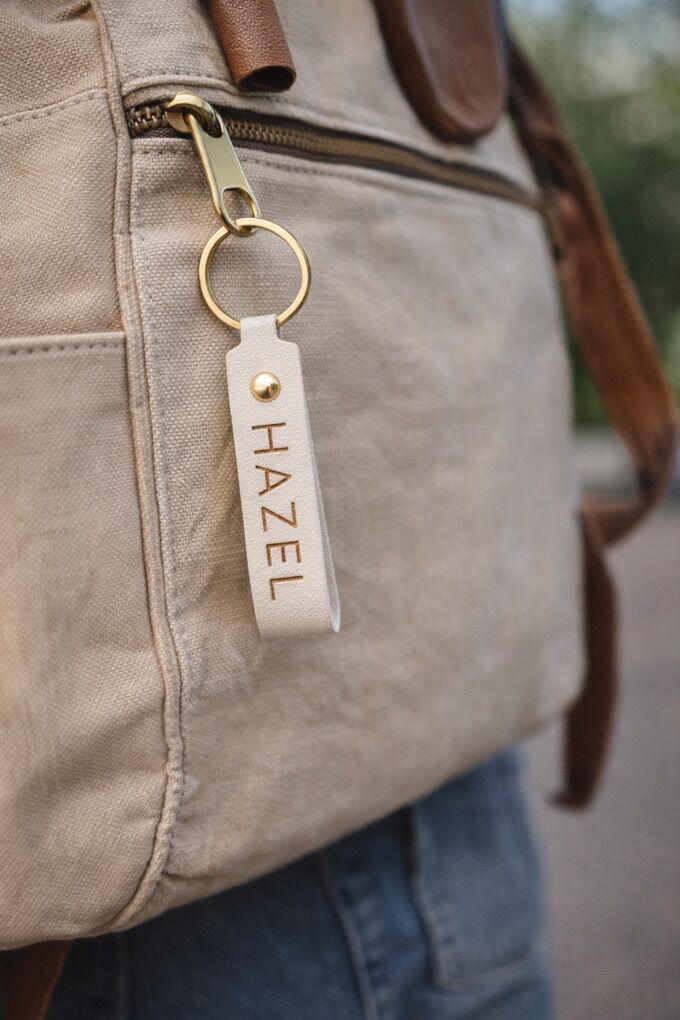 Details: • High-quality PU leather strap • Solid metal key ring & snap • One-side custom engraving • All caps lettering (as shown) • Vertical layout for a clean, modern look
