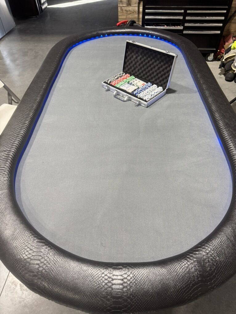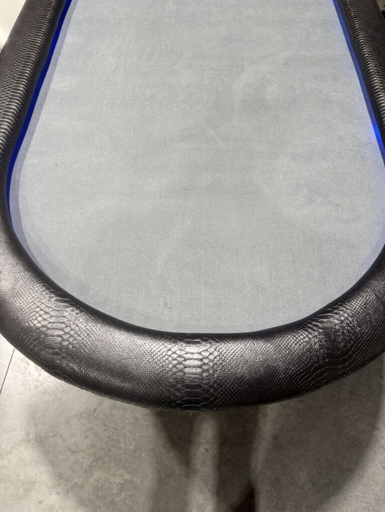 VenmoSweet custom poker table 4’x8’. Padded rail with lights that can sync to an app. Playing surface is detachable from legs