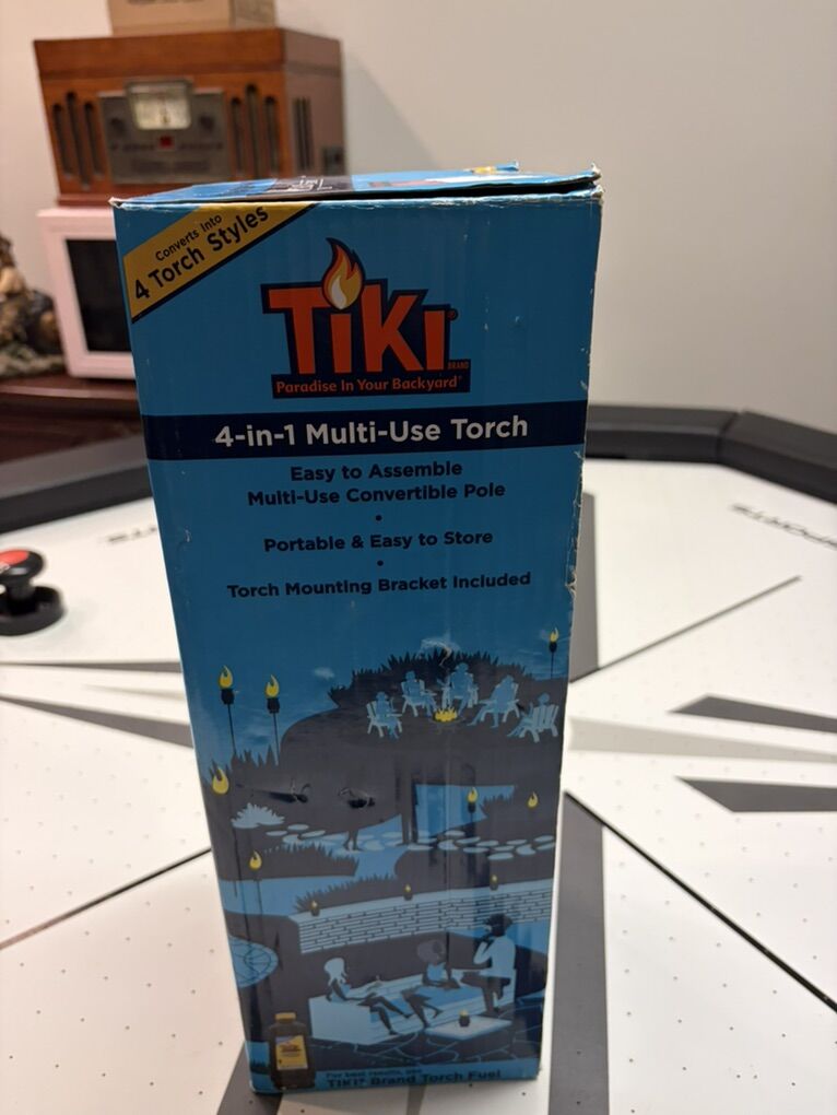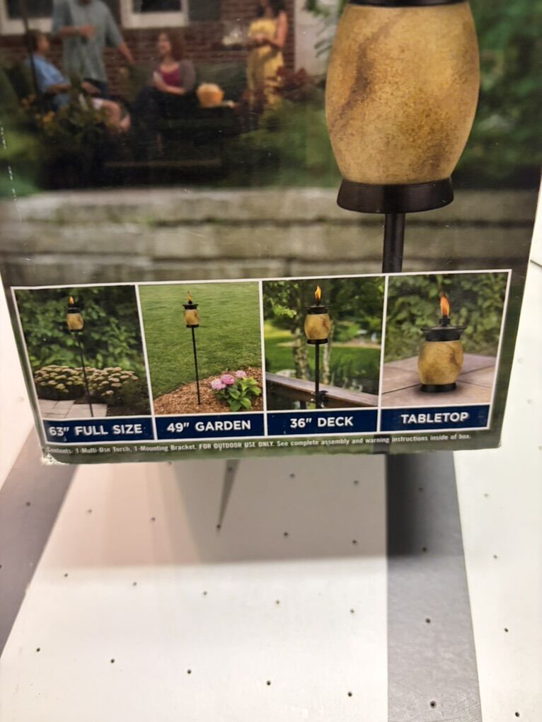 VenmoBrand new tiki torch which can be configured into four different styles. A full size torch 64-65 inches, a garden torch 49 inches, a deck mounted torch 36 inches or a tabletop torch.