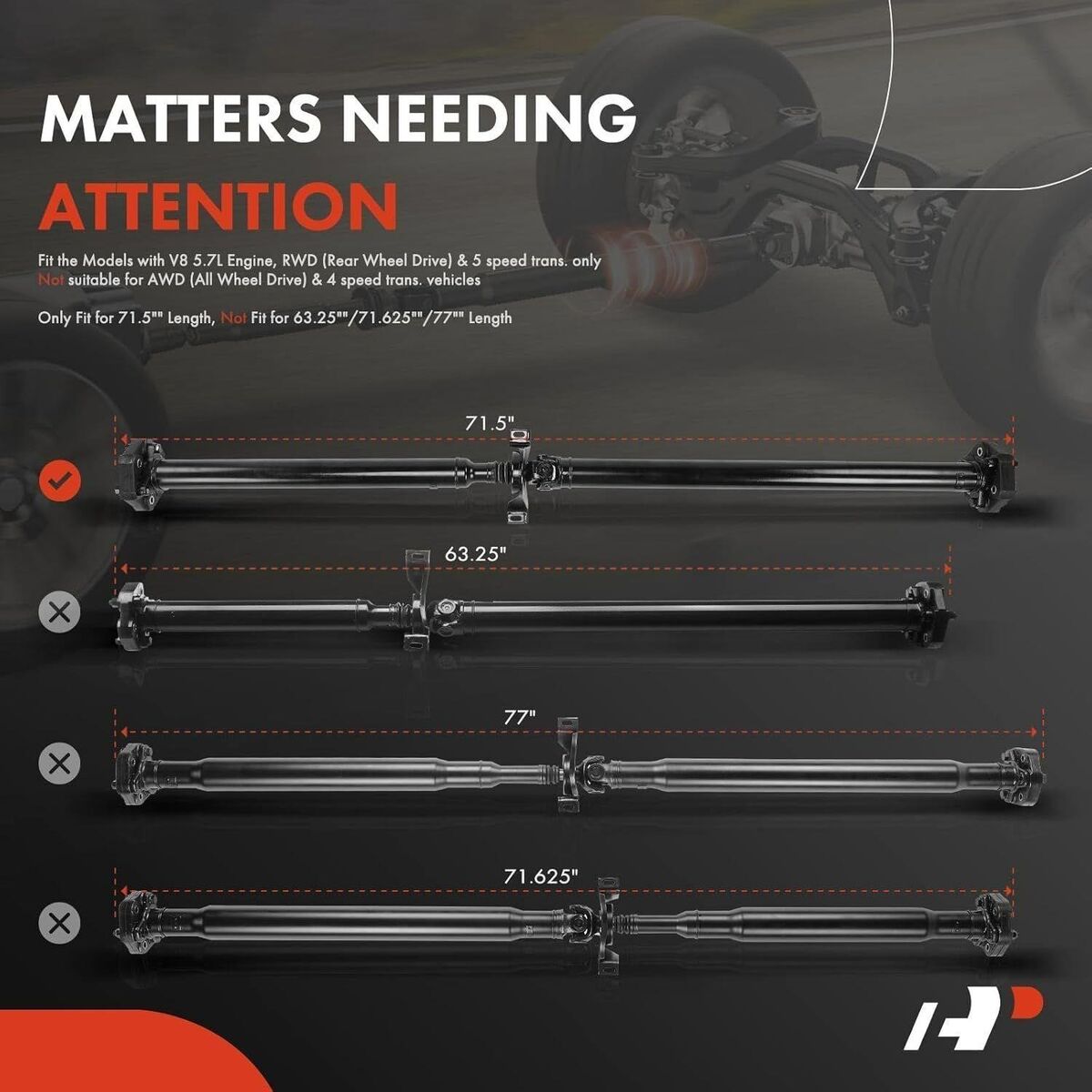[Product Description]: Position: Rear ; Shaft Length: 71.5 inch; Shaft Material: Steel; Shaft Diameter: 2.5 inch; Shaft Wall Thickness: 0.083 inch