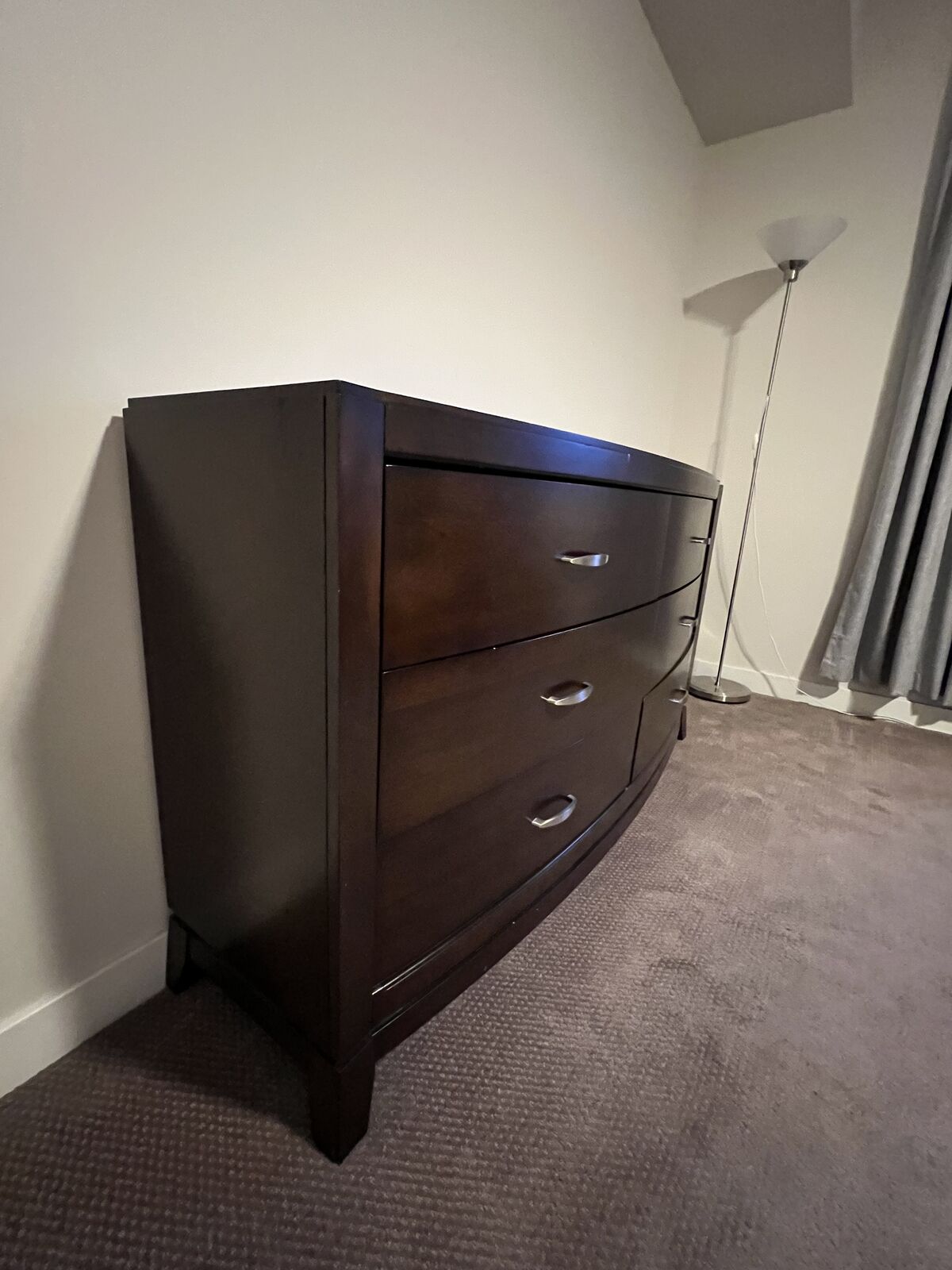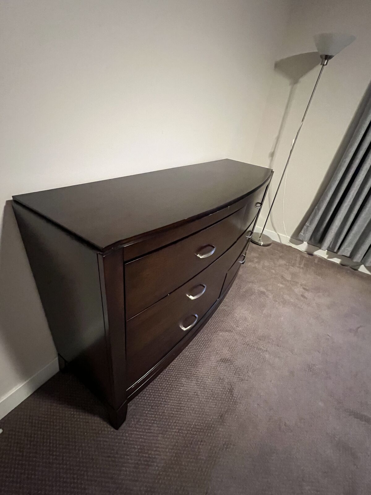 Dark wood dresser in good condition. Smooth drawer function, sturdy build, and classic style. Shows light, normal wear but no major damage.