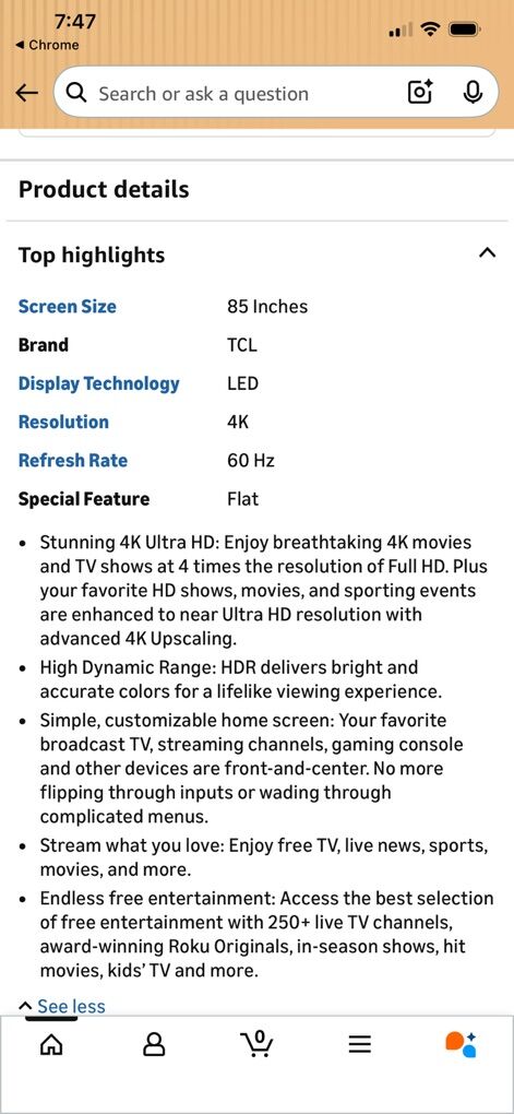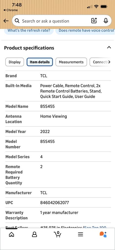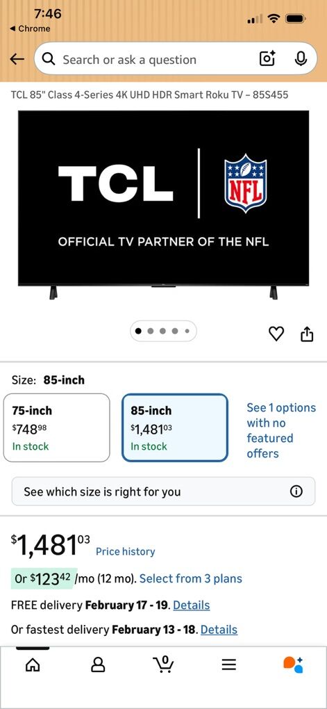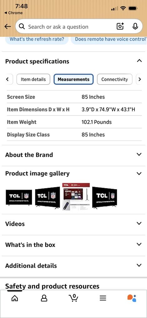 TCL 85” 4K Ultra HD TV, used for only a few months. New price is over $1400, asking $500. Excellent quality, excellent price! See pictures for more details.
