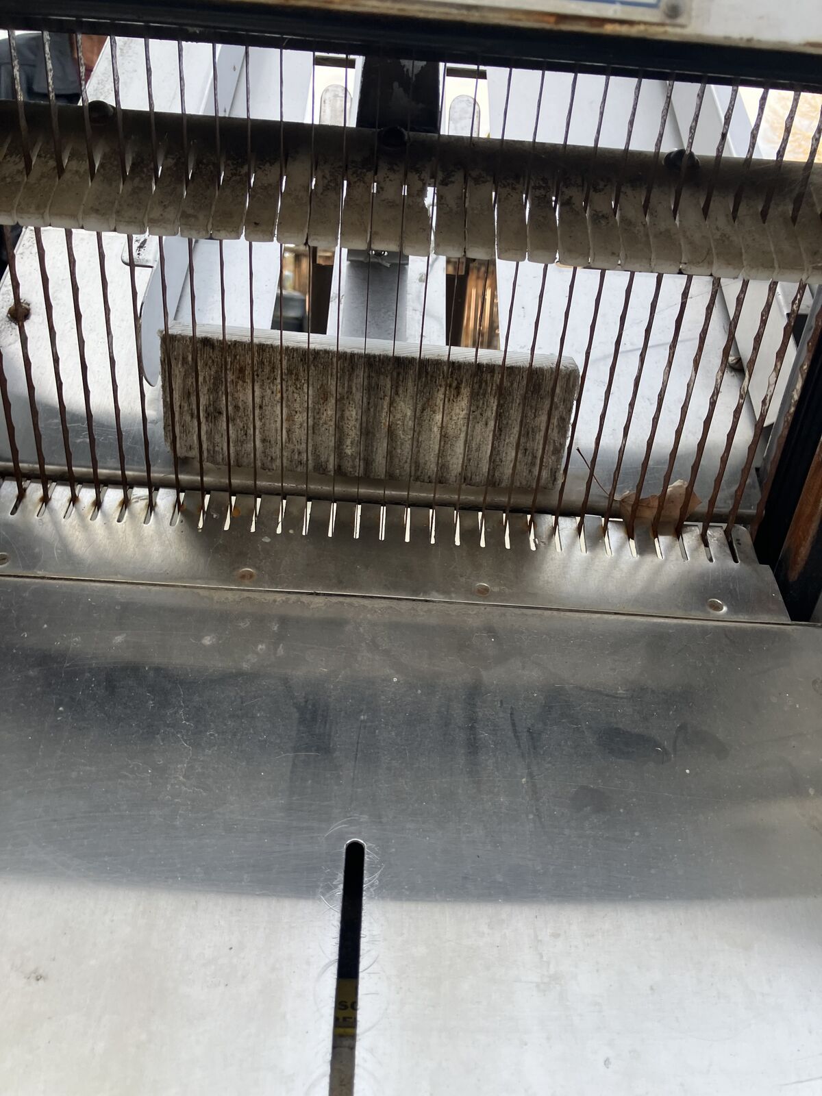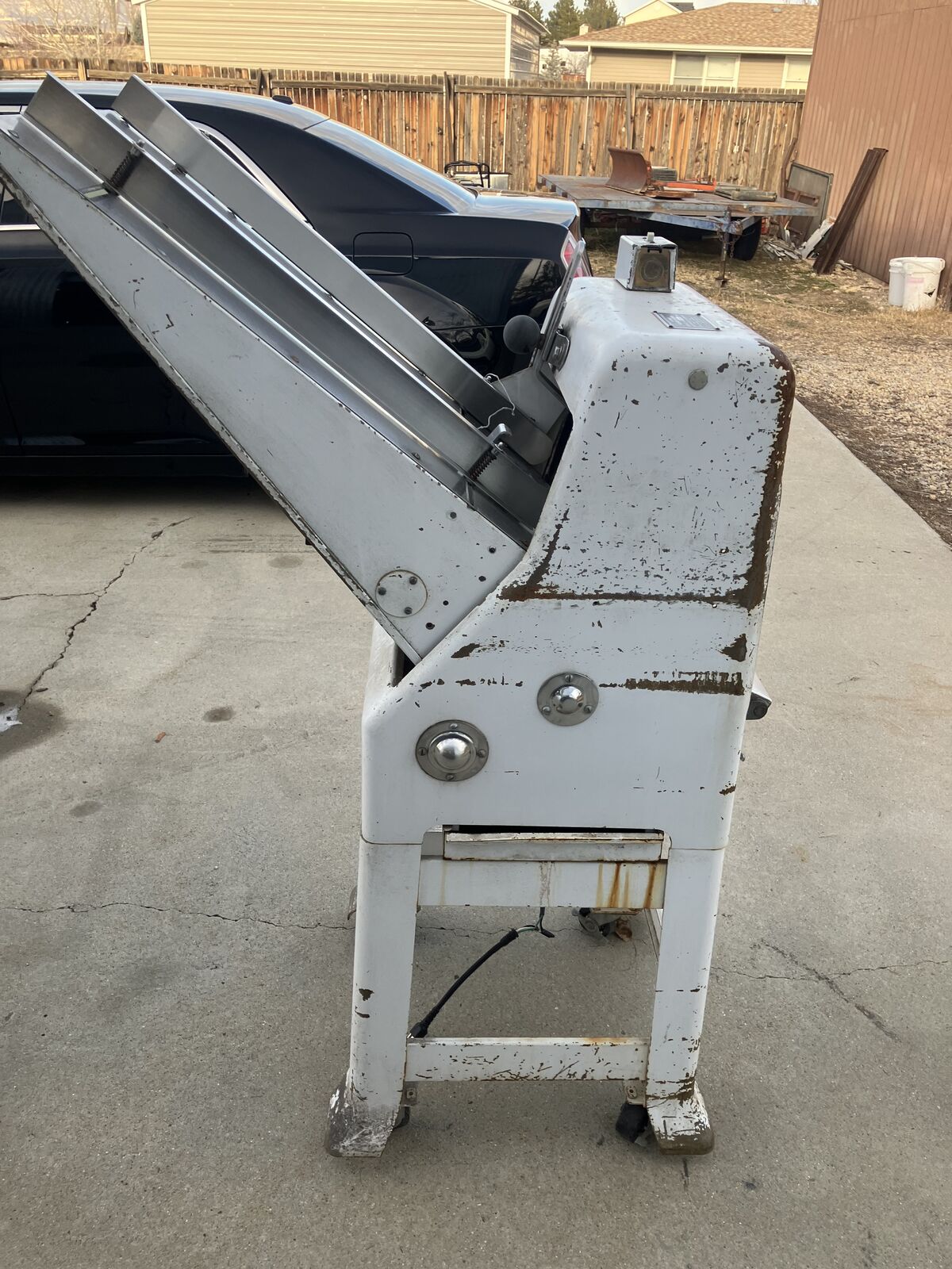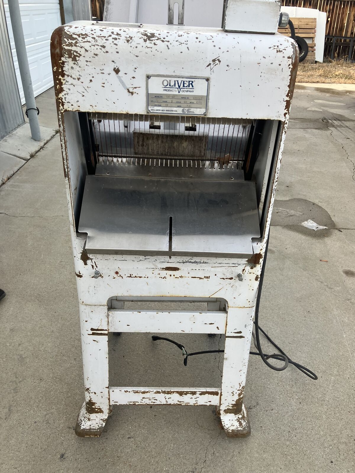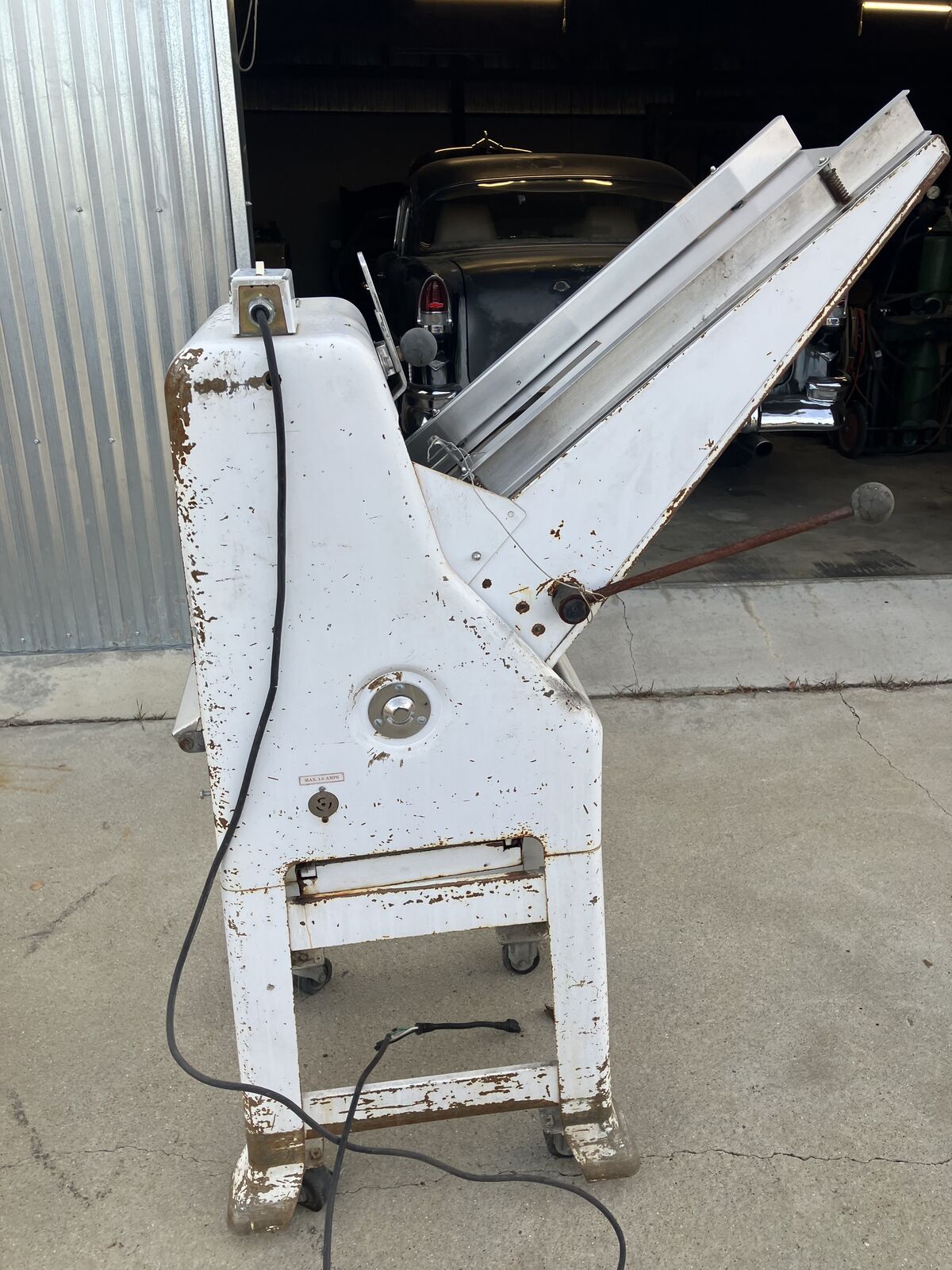 Industrial bread slicer cuts 1/2 inch thick slices. In working condition, just needs new blades.