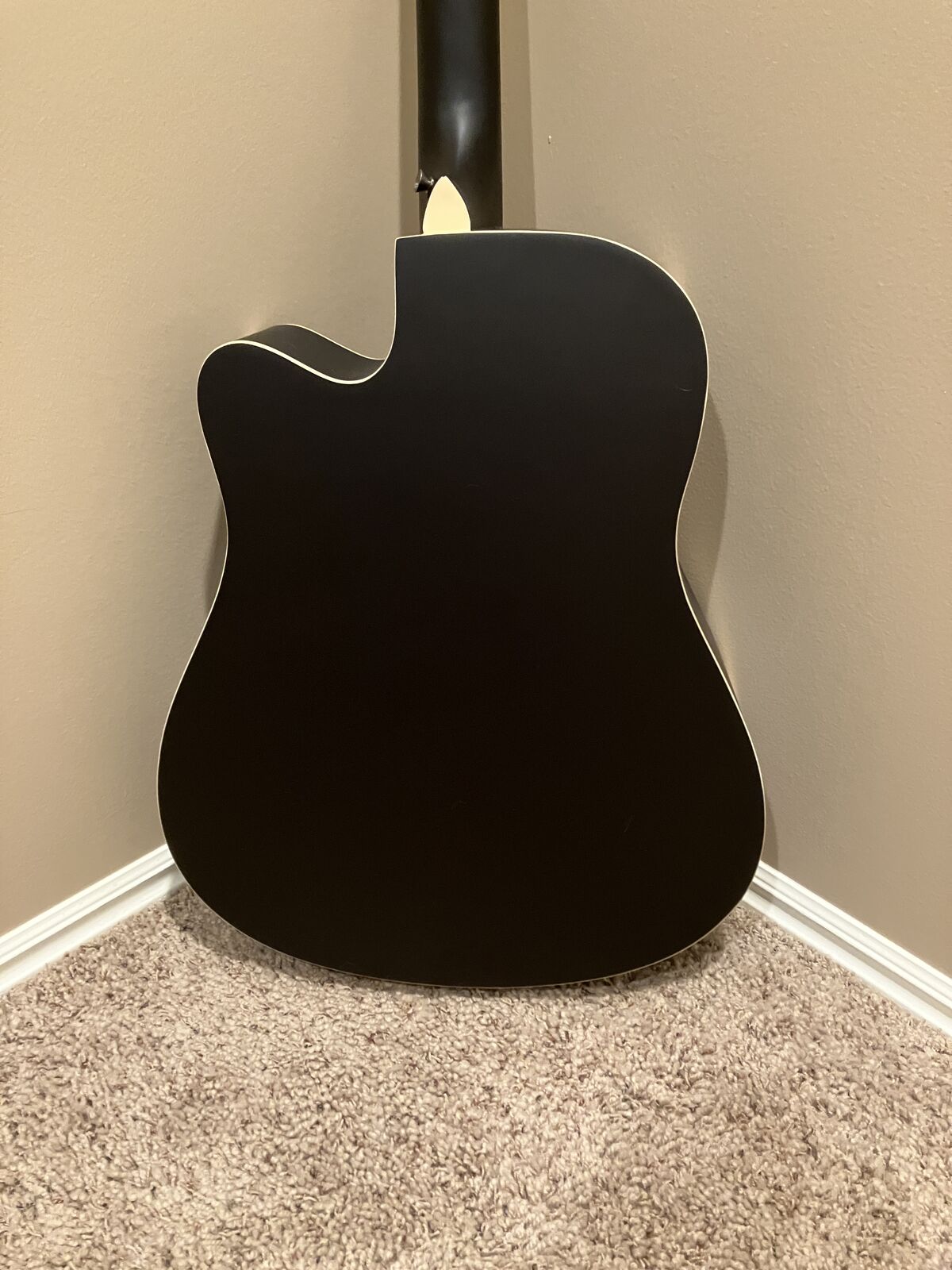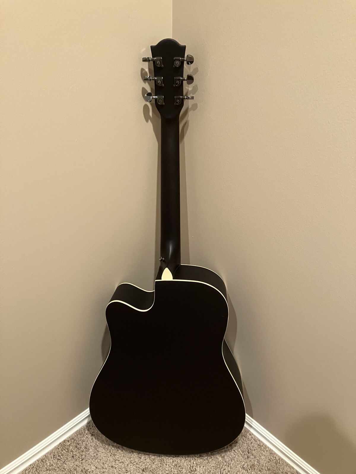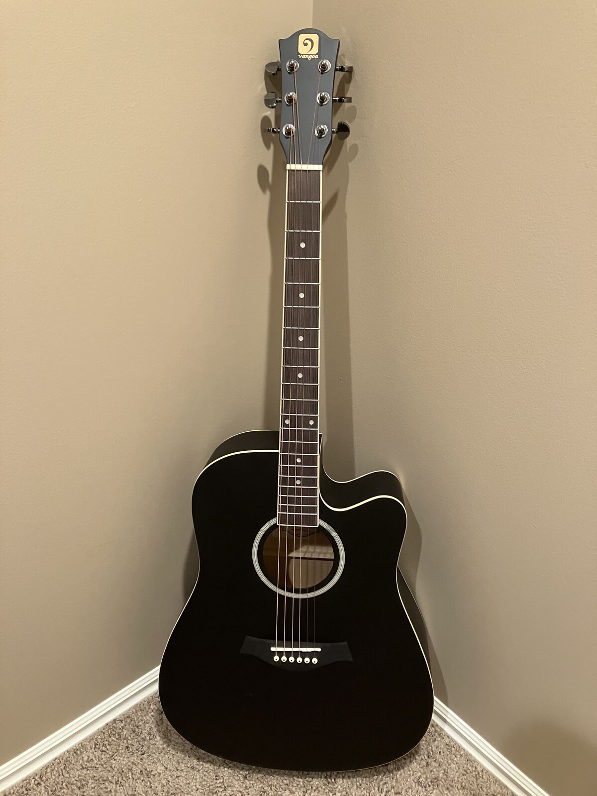 VenmoThis acoustic has a spruce top and mahogany back and sides. It has a cutaway body so you can easily reach the higher frets. It is in excellent condition. It plays easy and sounds very good. It comes with a Vangoa gig bag, strap, picks and the Chord Buddy System and book (a $24.99 value for just the device). Great guitar for learning or expanding your current ability. Come and check it out. I accept cash or Venmo. Not interested in trades.