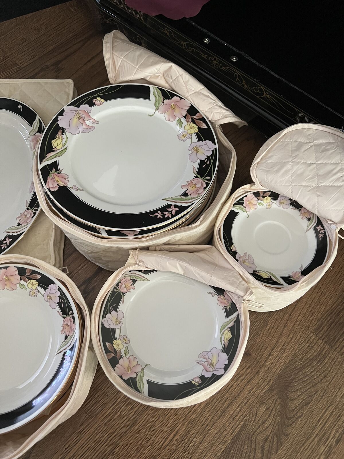 I have some beautiful Fine China Pearl ALICE 1990 14 1/2" Serving Platter, 12 round bowls, 12 dinner plate, sugar bowl & creamer, Salt & Pepper , bread plates and tea cups with plates too. There is one tea cup the has broken handle but the rest are in good shape. I also have extra to go with like the bread basket that are gold to match with the dishes with gold rim around the dishes. I also have extra napkins holder and also match the dishes. Butter dish plus more, etc. Great for holidays or celebrations.