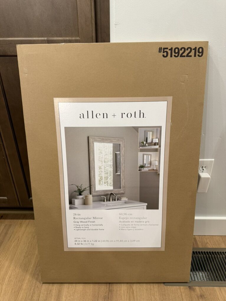 VenmoNew allen + roth mirror. Has a stylish gray wood finish. Measures 24 x 36 inches. Can hang vertically or horizontally. durable frame. Opened for photos only. $45 each — 2 available.