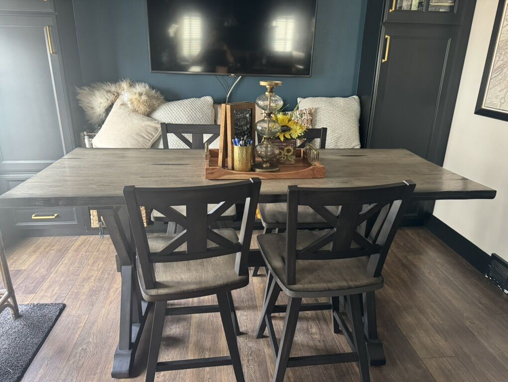 VenmoOrlando Sand and Black Counter Height Dining Table. This table and chairs are is excellent condition. The table measures 72 inches long and 29 1/2 inches width. 38 inches height.