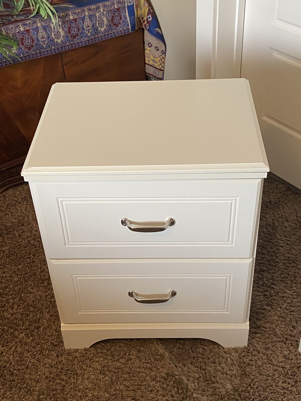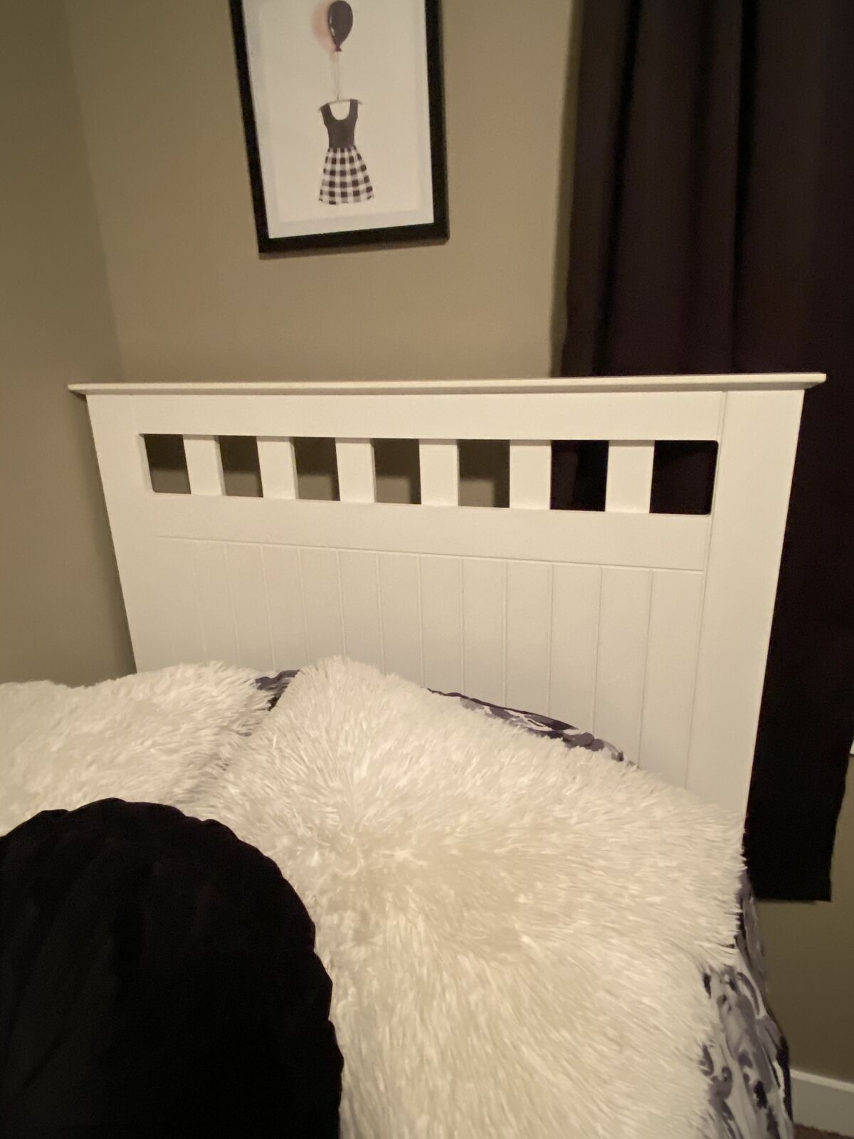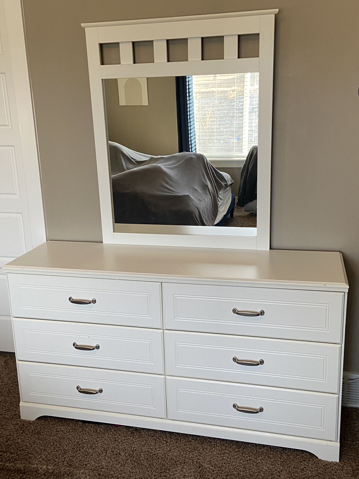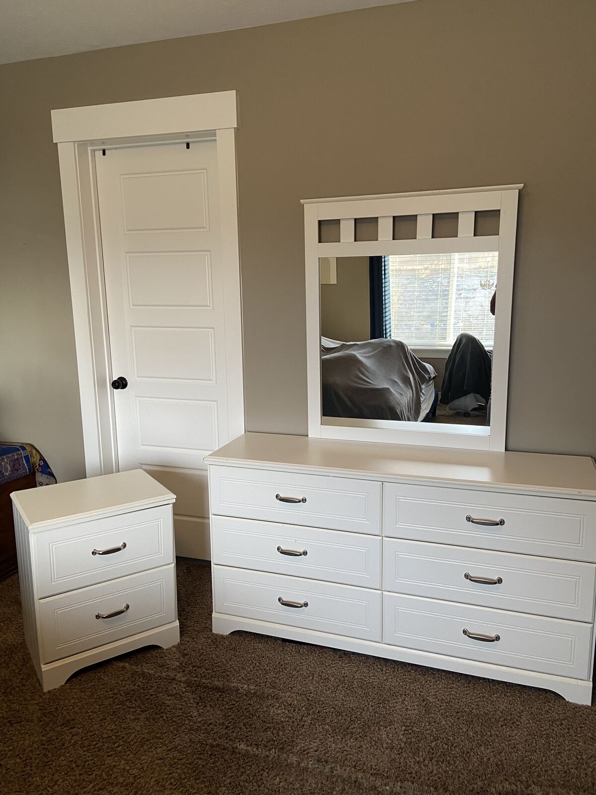 White twin bed with mattress and box spring. It also comes with a 6 drawer dresser with a mirror and a night stand. Overall in pretty good shape. Some imperfections throughout the set but most on the dresser drawer in the pictute i have posted. Dimensions