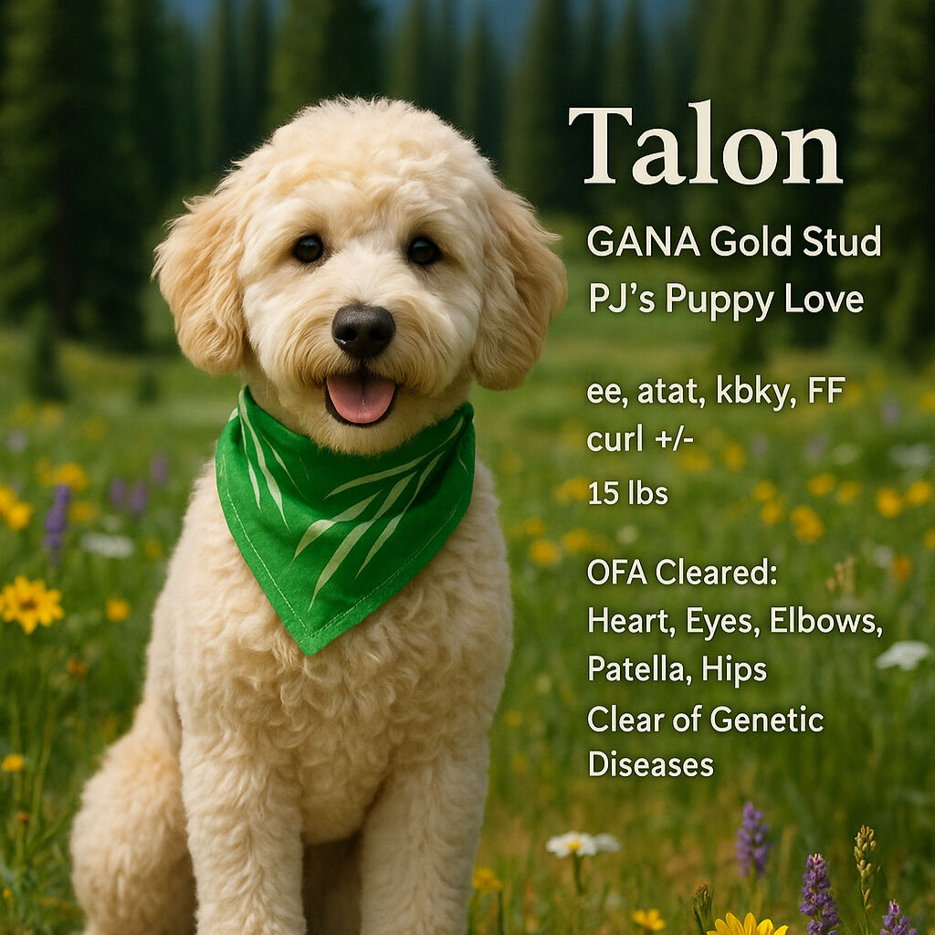 Griff (aka Talon) is a 15 lb multi-generational F1B Mini Goldendoodle, registered GANA Gold Level, backed by over 5 years of Gold Level breeding standards through PJ’s Puppy Love.