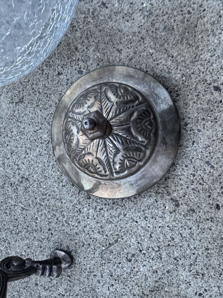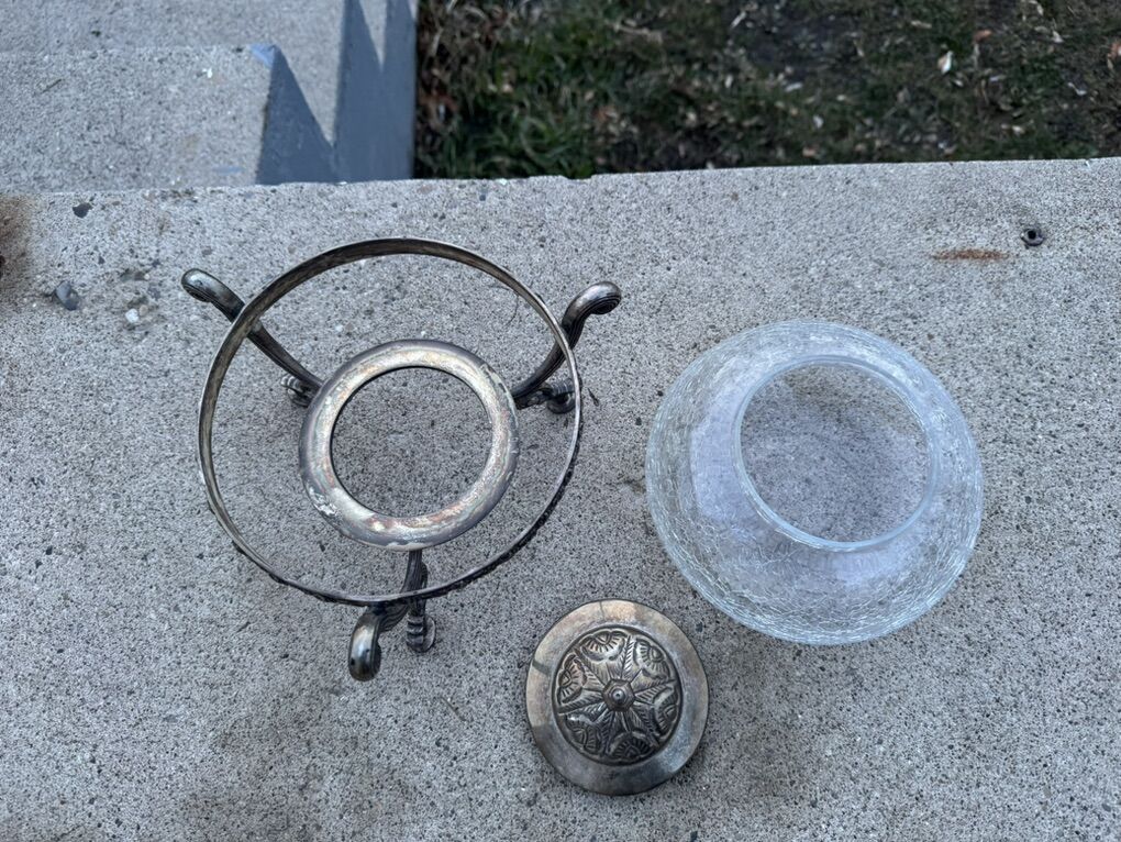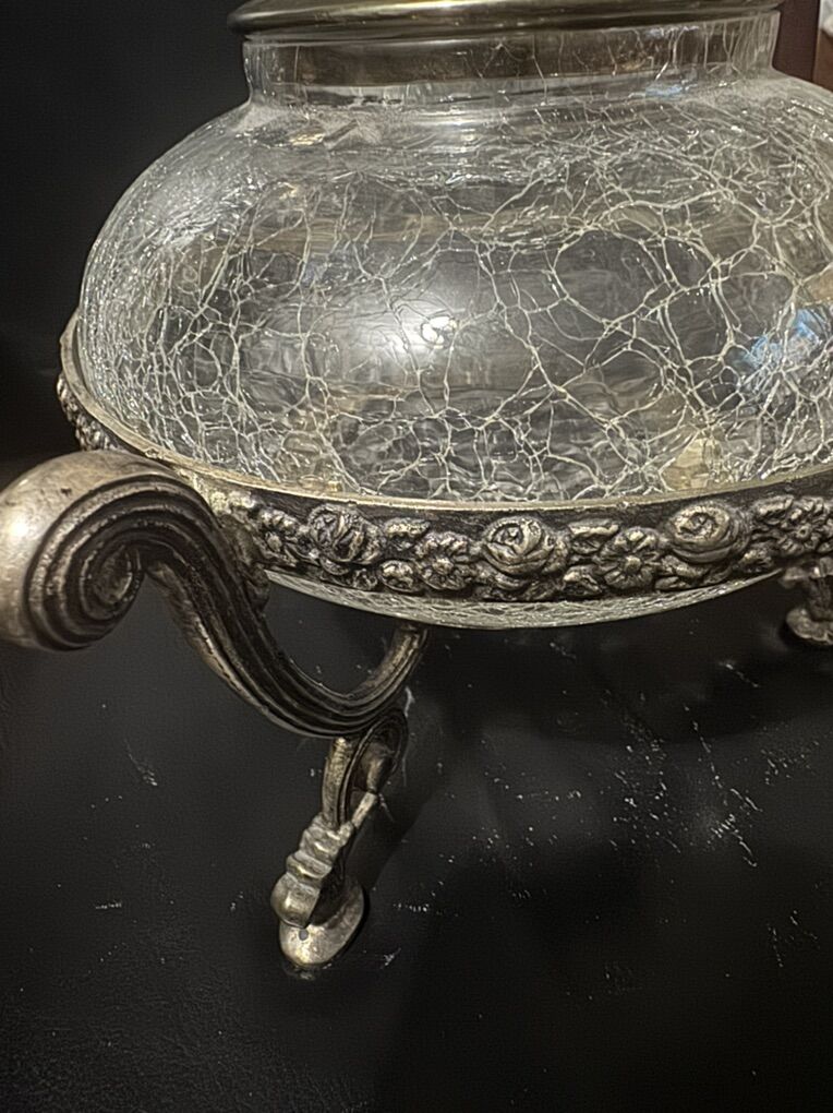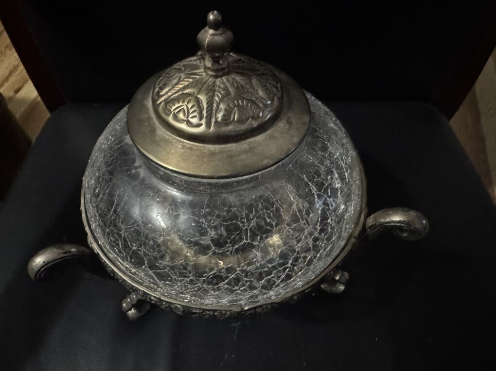 VenmoDecorative metal sugar bowl or serving dish with a crackled glass bow, in great condition , beautiful shape. No broken, No scratches 8” Tall 7” Width It is a vintage-style object, possibly from the mid-century or earlier.