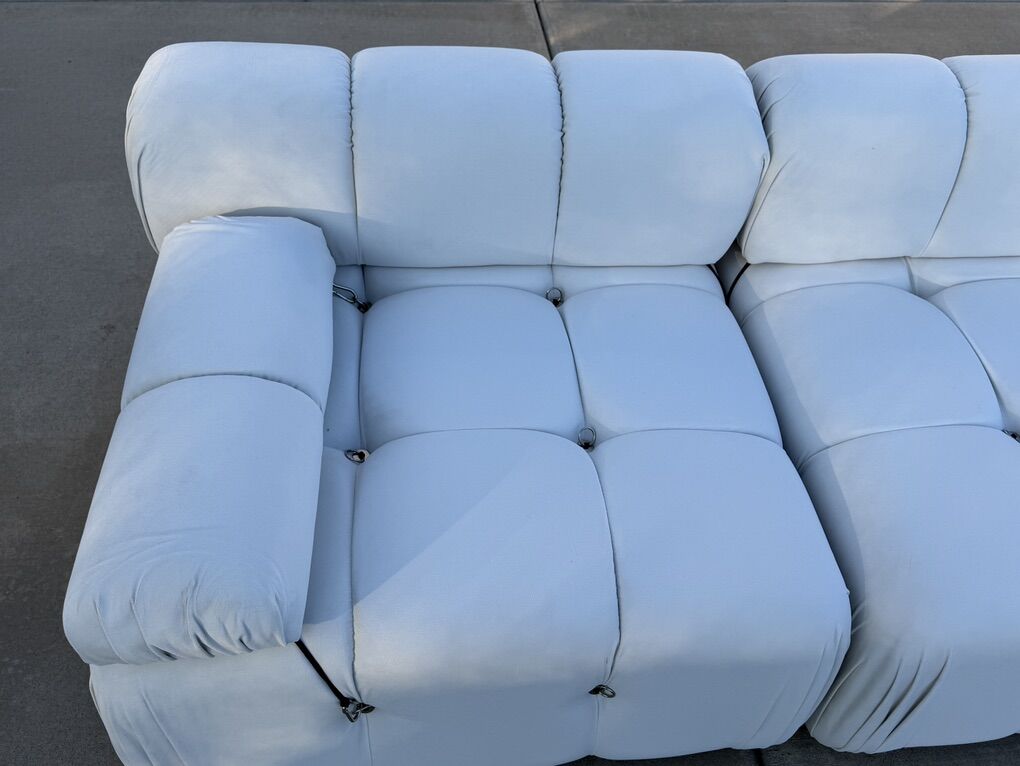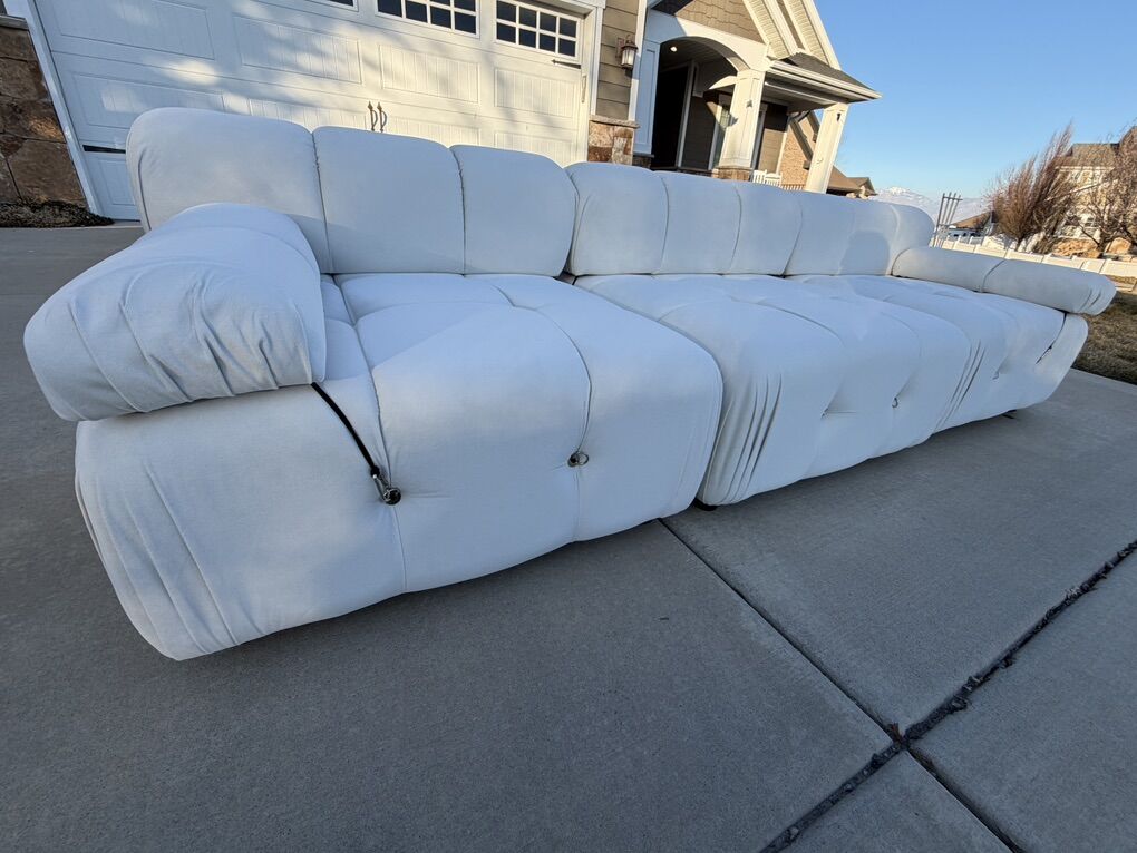 Large modern modular couch with a super comfortable deep lounge feel. Clean white color with a unique tufted design that gives it a high-end, contemporary look.