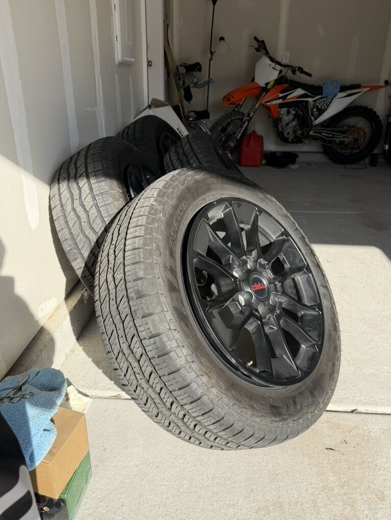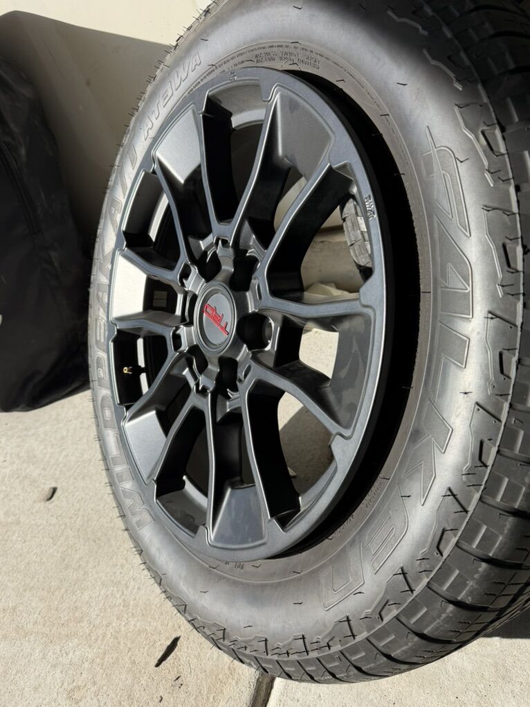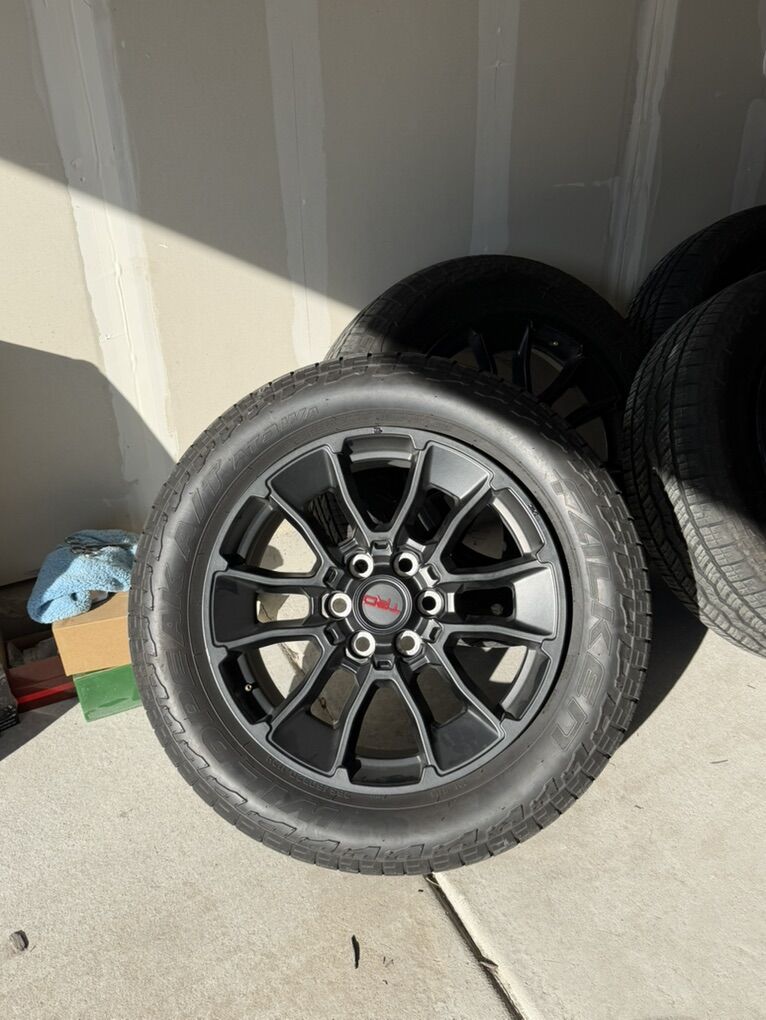 I have a set of OEM Toyota Tundra TRD off road wheels and tires. They are Falken Wildpeak A/T 265/60R20 tires. It will fit bolt pattern 6x139.7 mm (also expressed as 6x5.5 inches). Looking for $800 OBO. Tires have 6,000 miles on them.