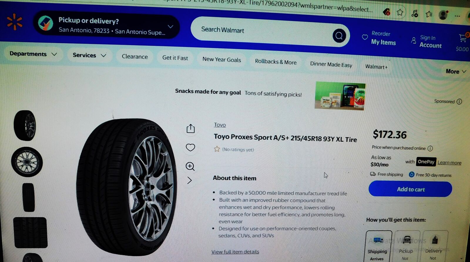 Set of 4 215 45R 18 Toyo Proxes sport A/S all season like new $240 $60 per tire Walmart $172 per tire