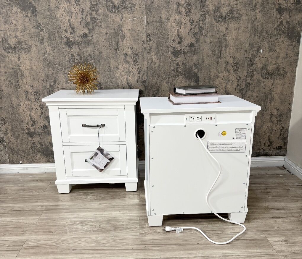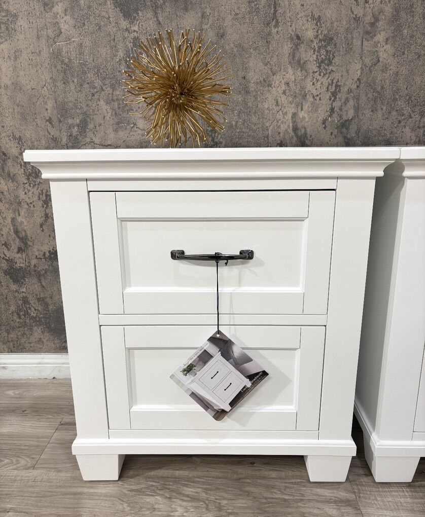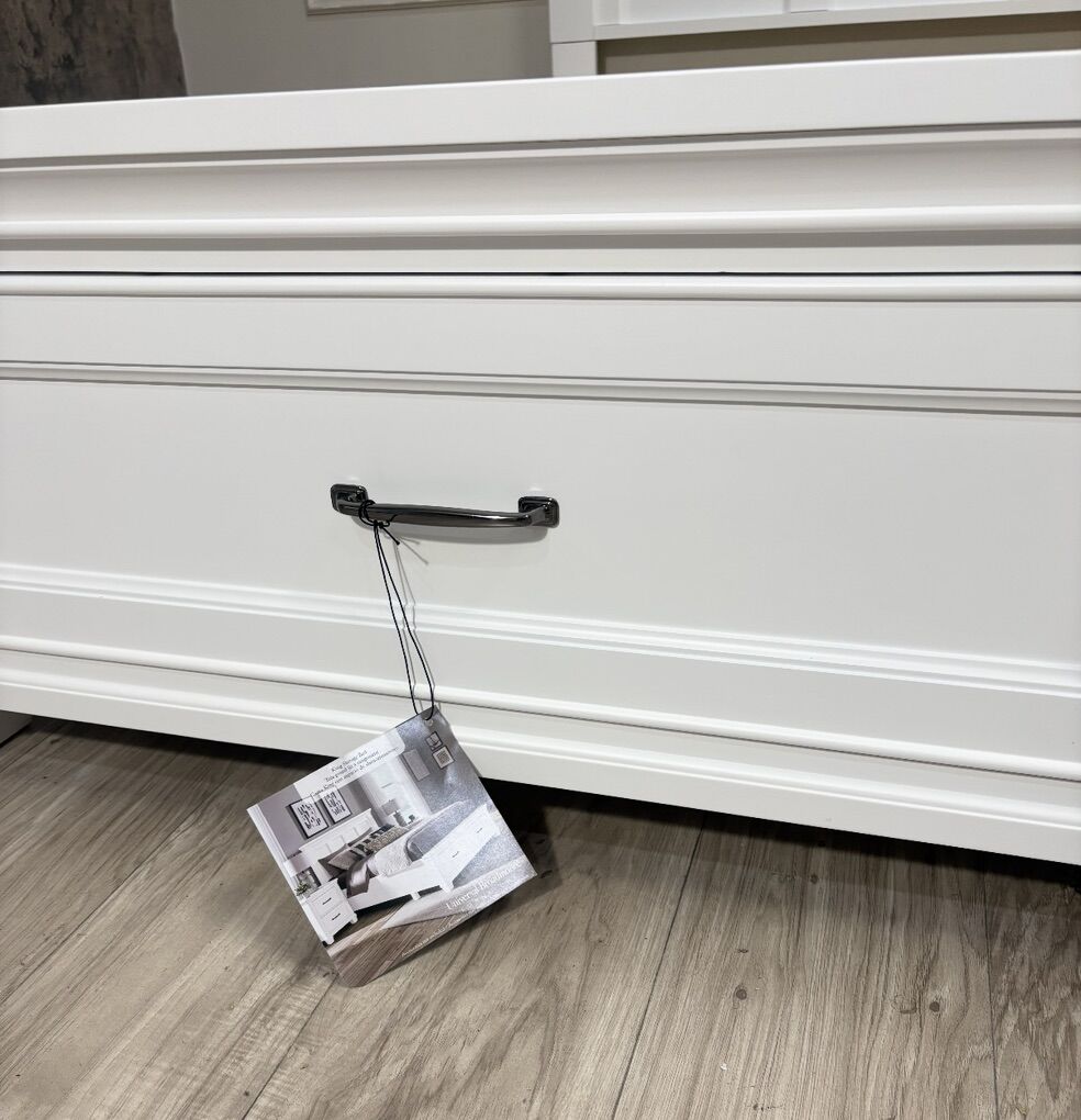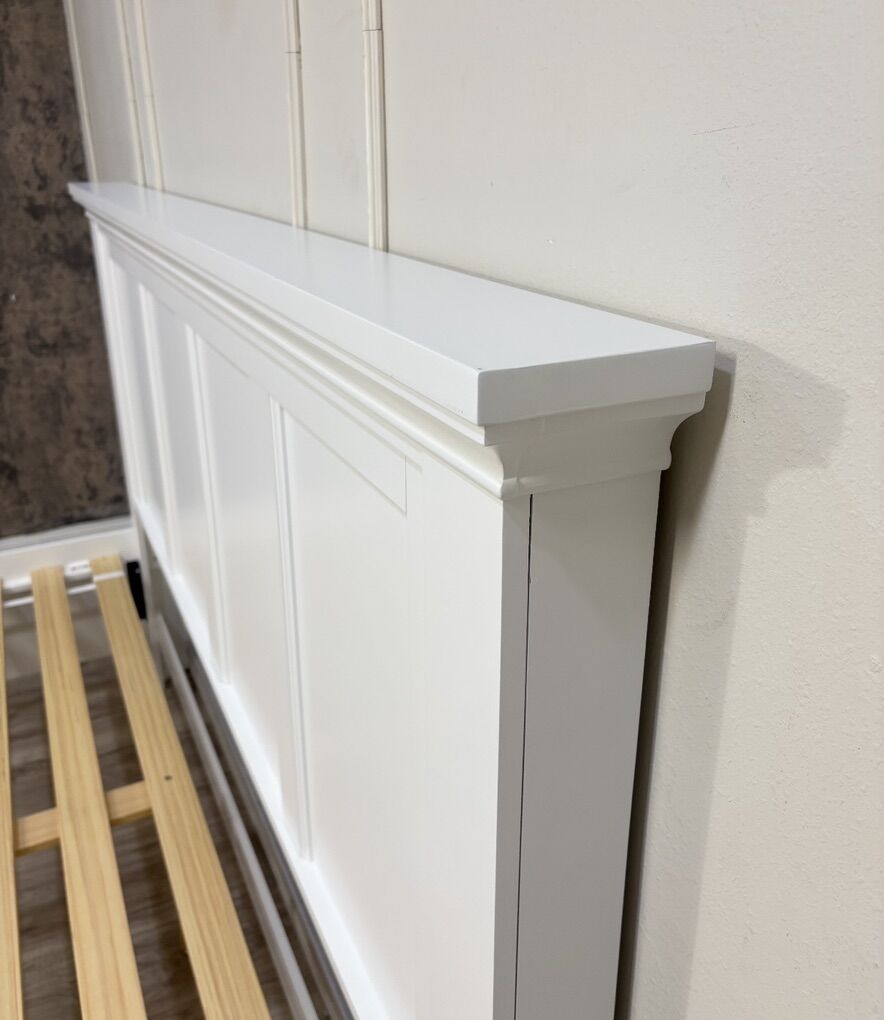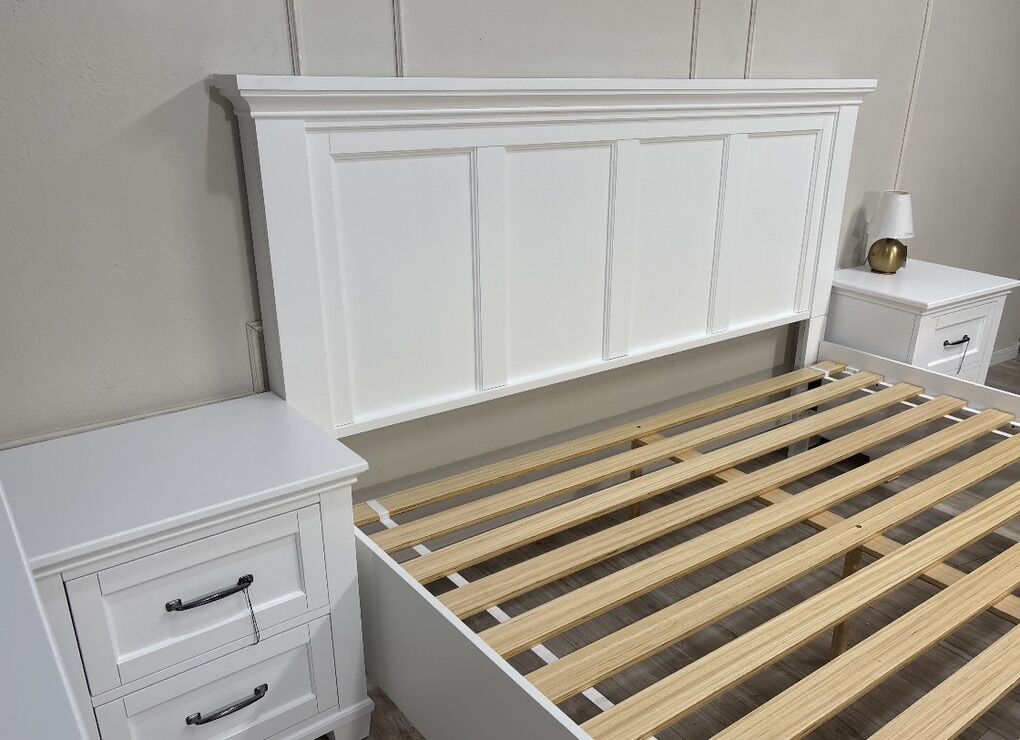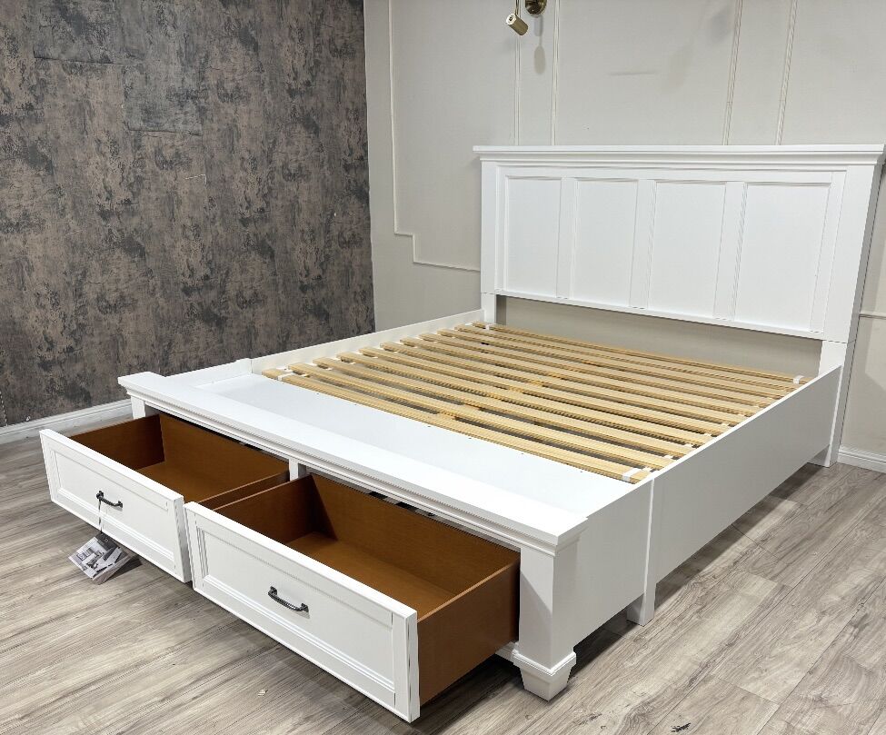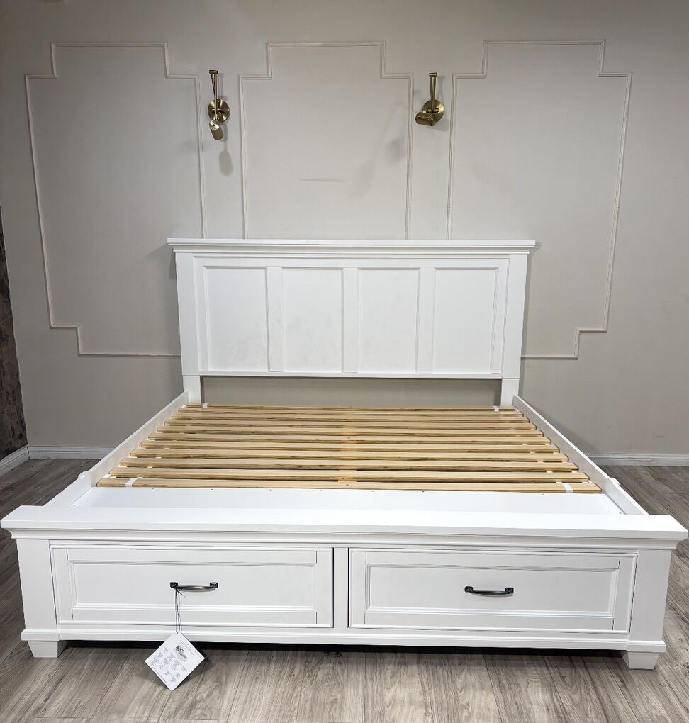 Color: White Painted Finish Constructed from Rubberwood Solids with Birch Veneers Two Storage Drawers with English Dovetail Construction and Soft-Close Drawer Guides Graphite Toned Hardware Slat Roll Included, Box Springs Not Required
