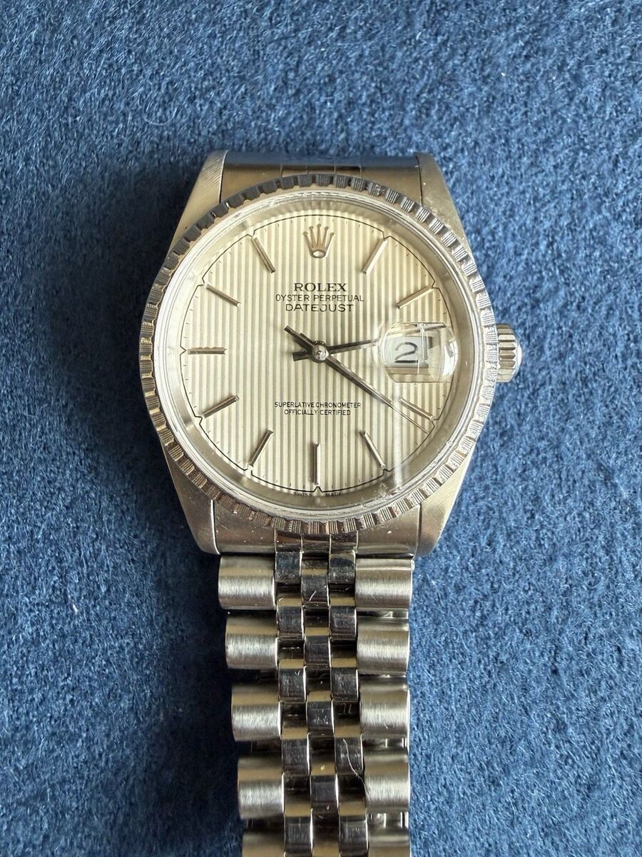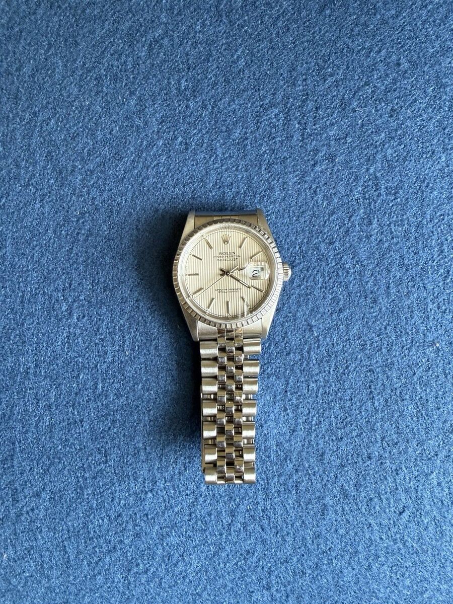 For sale is a Rolex Datejust reference 16220 with a tapestry dial and stainless steel Jubilee bracelet. Serial number dates the watch to the 1990s. Classic 36mm size with sapphire crystal and engine turned bezel.