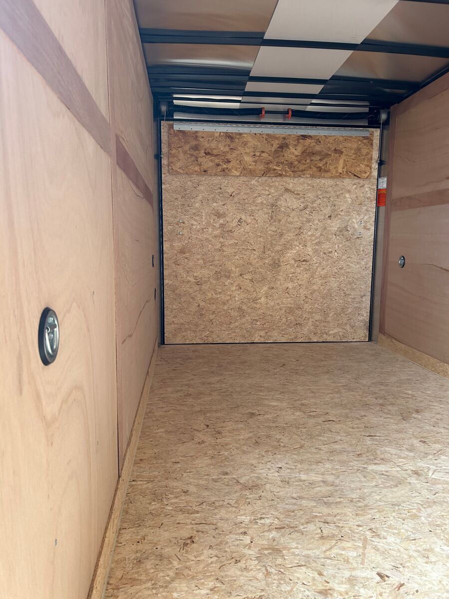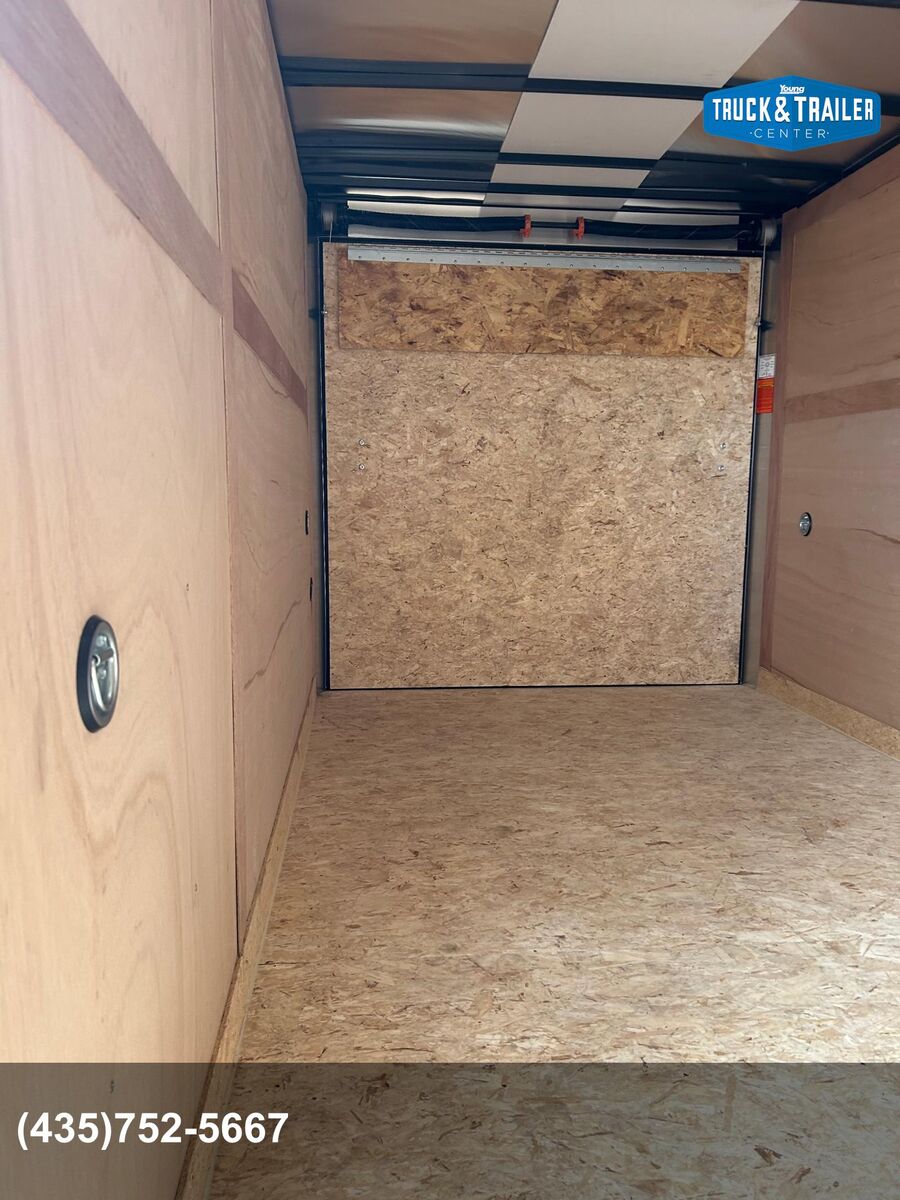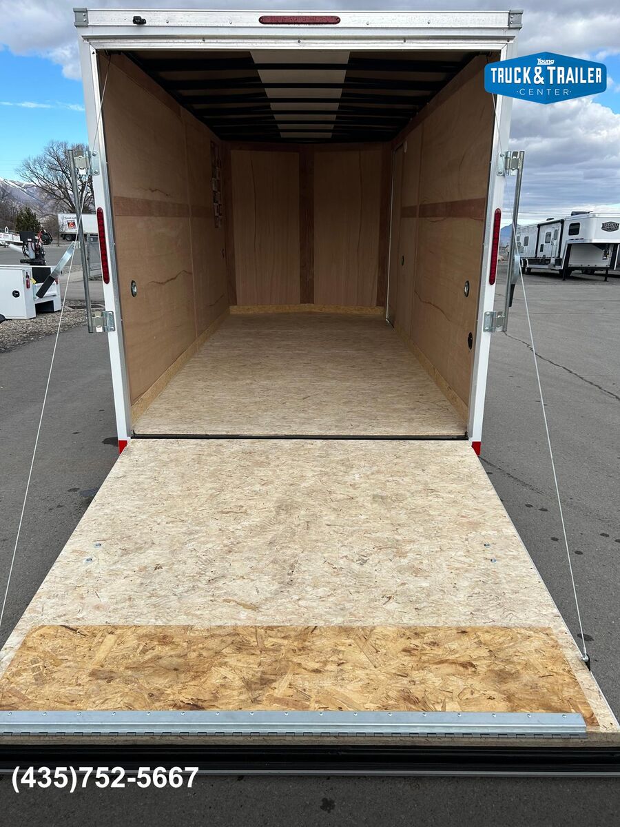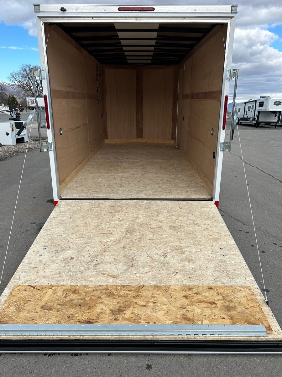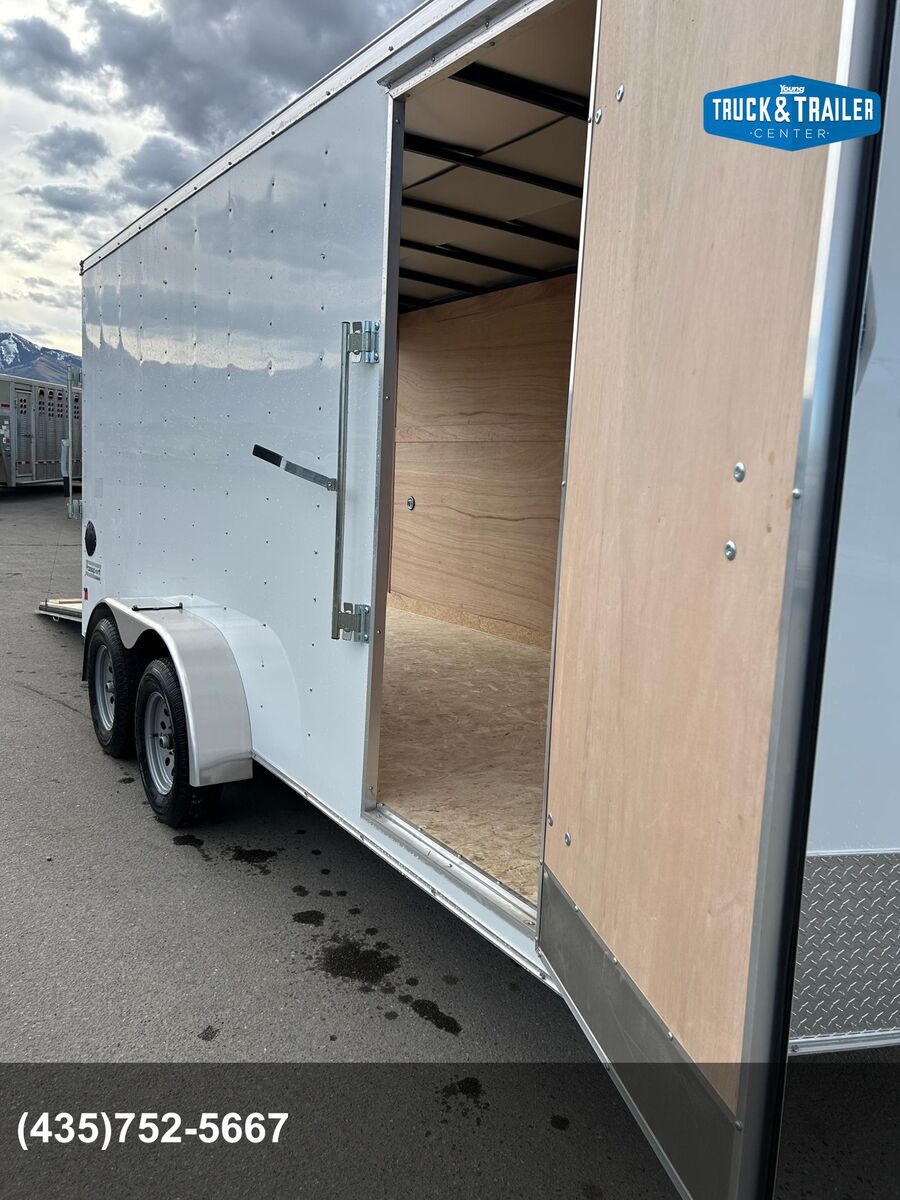 7' Tall Entire Chassis Undercoated White .024 Aluminum Exterior (With Screws) Safety Chains 3/4" PlexCore High Performance Decking Silver Mod Wheels E-Z Lube® Hubs Pass-Thru Side Door with Flush Lock & Dead Bolt Rear Ramp Door with Spring Assist Flow-Thru Sidewall Vents 12v LED Exterior Lighting 16" OC Floor Crossmembers 16" OC Vertical Posts 15" Radial Tires 16" Starbright Stoneguard Smooth Aluminum Radius Fenders 12v LED Dome Light Economy Sidewall Liner Spring Axles with 4" Drop 1-Year Limited Warranty 2" x 3" Tube Main Rails (Single Axle) 2" x 4" Tube Main Rails (Tandem Axle) 24" OC Tube Roof Structure