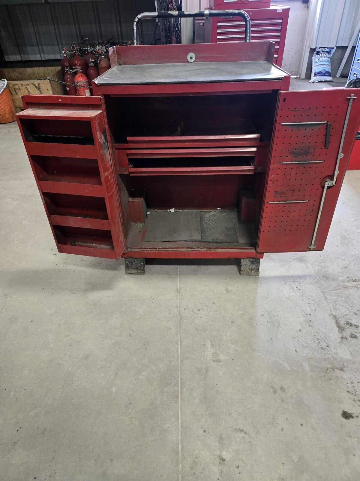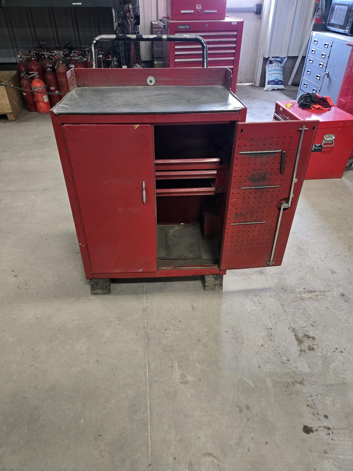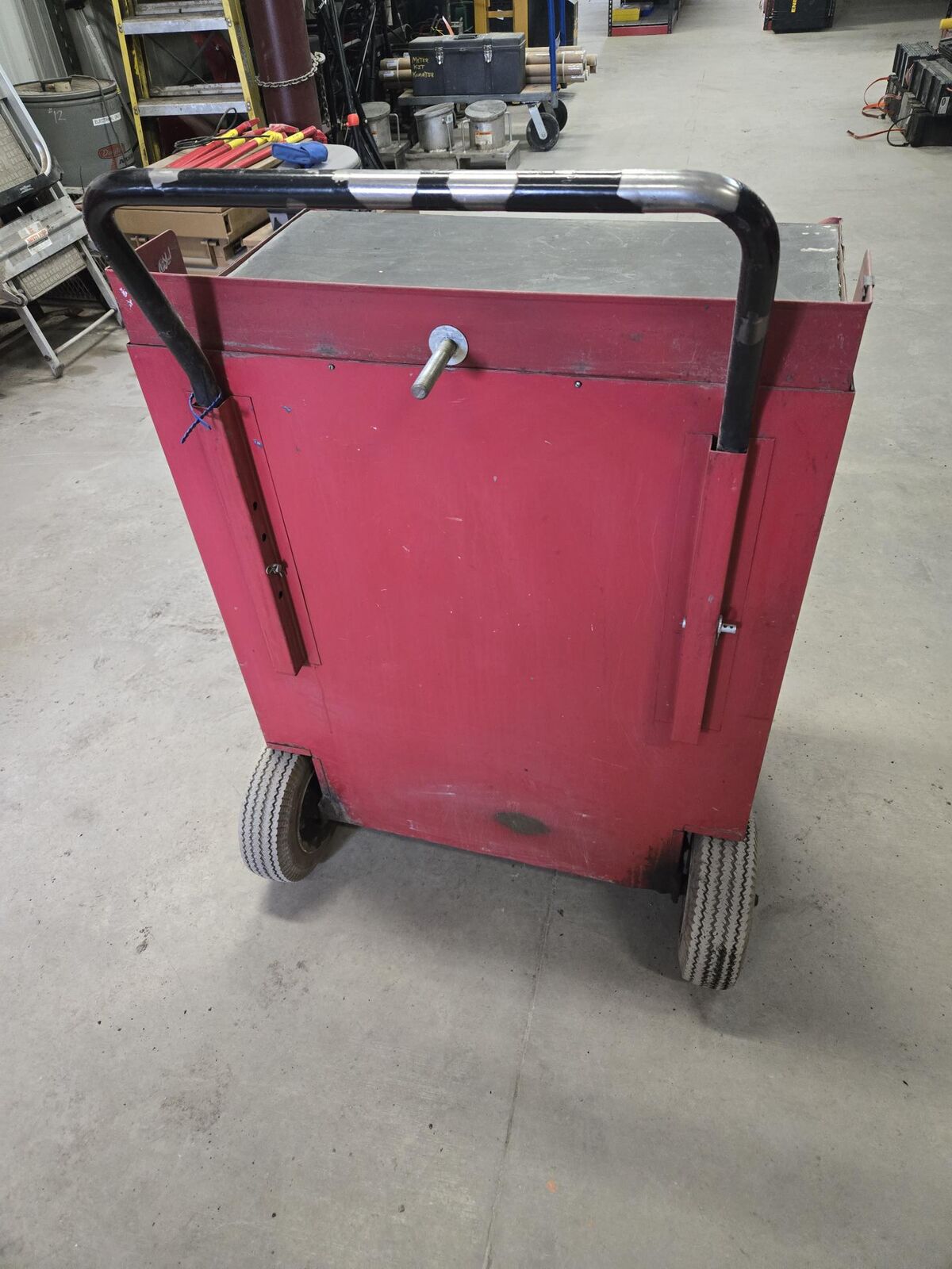 Welders tool box, Has key and locks, 3 drawers, 2 work one is pulled out and sitting on shelf inside. Box measures 28"WX32"T Has rubber tires and Adjustable handle on back. Needs cleaned. $75.00 Plus tax