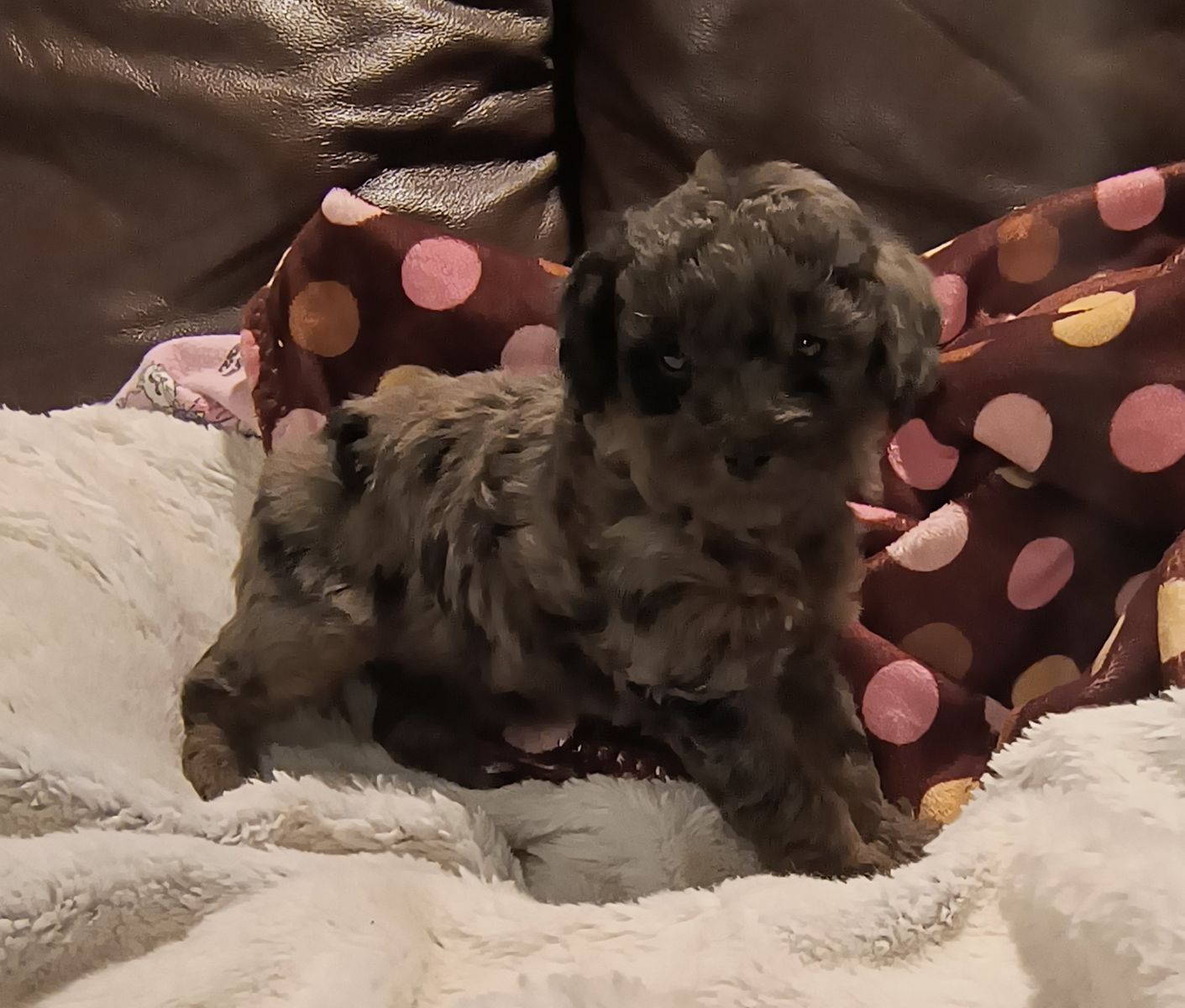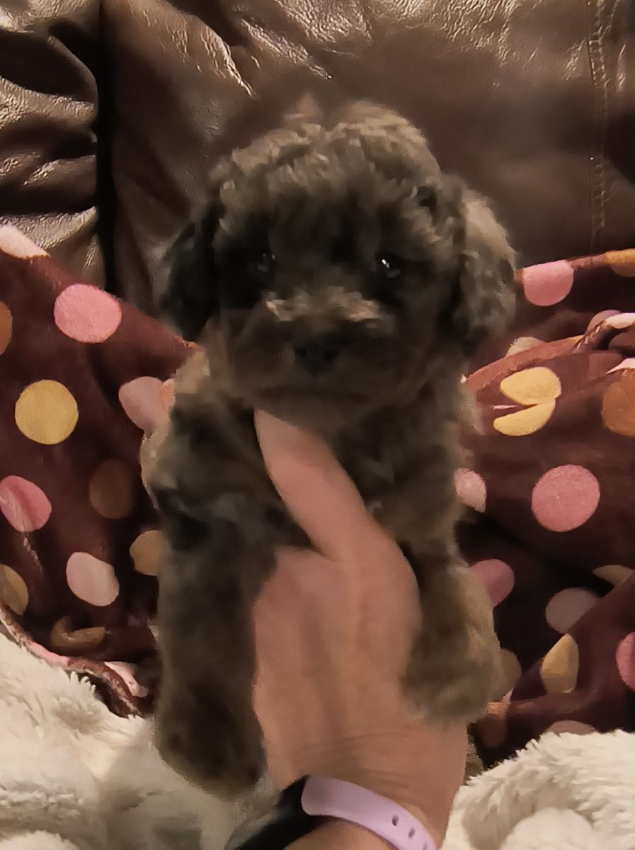NO BREEDING RIGHTS. -Offered as pet only to be spoiled, pampered, and loved.-Tiny multi-generation Cavapoo puppy -born on January 31st and will be ready to find her family on March 28th. -One loving blue merle female. These puppies are very social, happy and loving. They would make great support buddies. The little girl is charting to be right around 7 lbs as an adult. Mom is a 4 pound second generation blue Merle Cavapoo. Dad is a 4 pound Brown Poodle. They are hypoallergenic and do not shed. She has had her first vaccines and is completely de-wormed. Vaccination and de-worming record will be provided along with a sample of food and a blanket that smells like Mom. -Offered as a pet only with no breeding papers. -A $500 non-refundable deposit will hold for you. Cash only. I have been raising these little guys for 47 years and offer 24/7 lifetime support. -Please call if you have any questions. I don't always receive text so please call. (801)854-8401