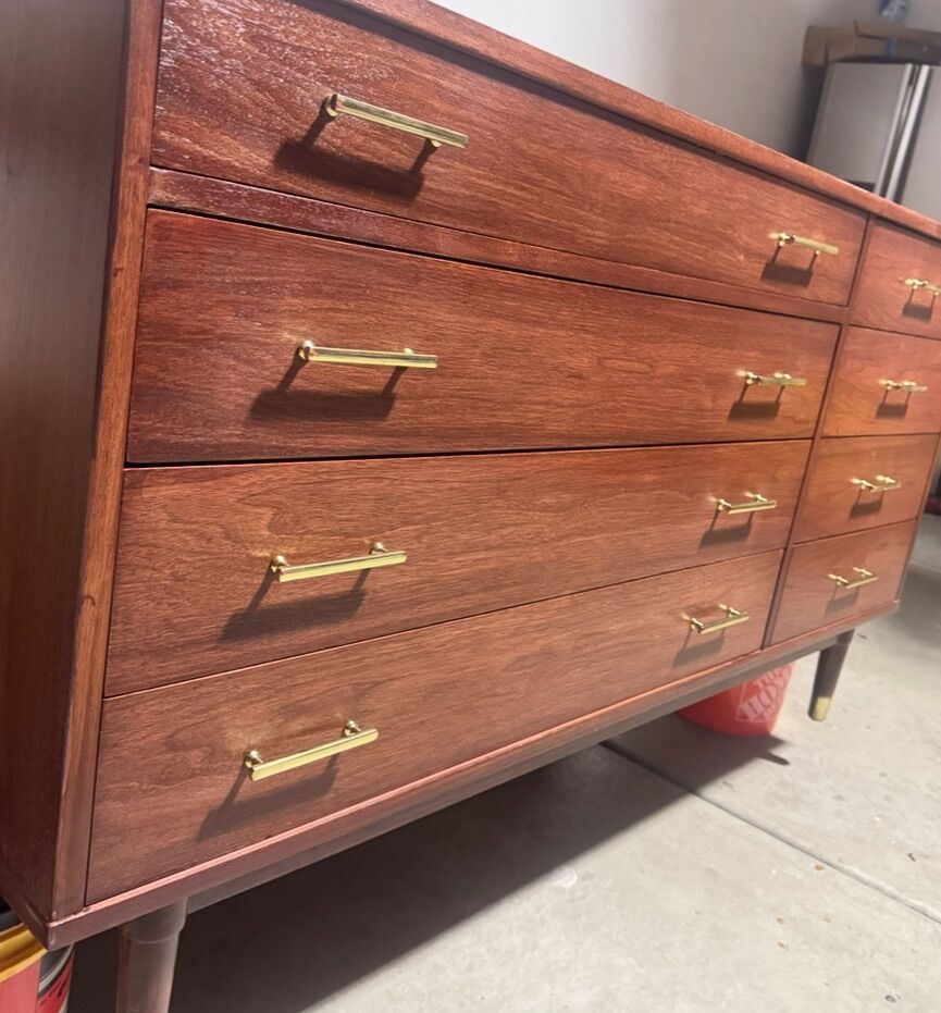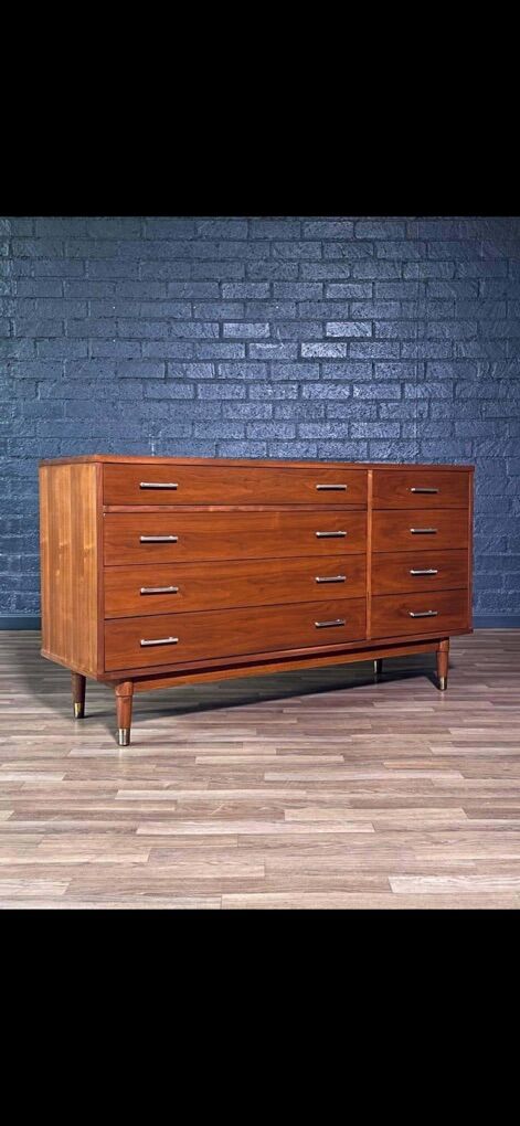 Features a long, low profile with nine spacious drawers, sleek brass hardware, and classic tapered legs. The walnut finish has been professionally refreshed, bringing out the natural grain while keeping the original mid-century character intact.