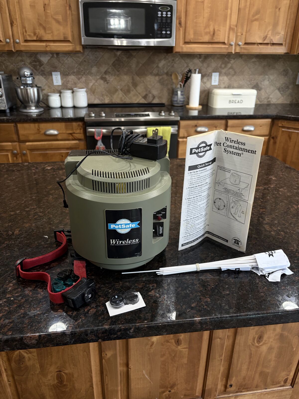 VenmoPetSafe Wireless pet containment system. This system sets up a parameter. The collar will make a sound and a mild shock to remind the dog where the boundary is. This worked very well for our dog and we eventually took of the collar and he still stayed in the yard. Comes with the collar, a battery, parameter flags the control unit and instructions.