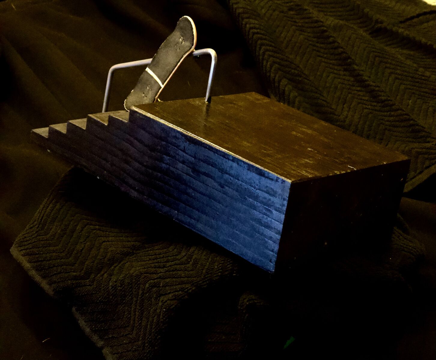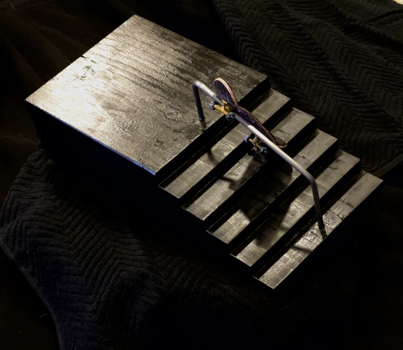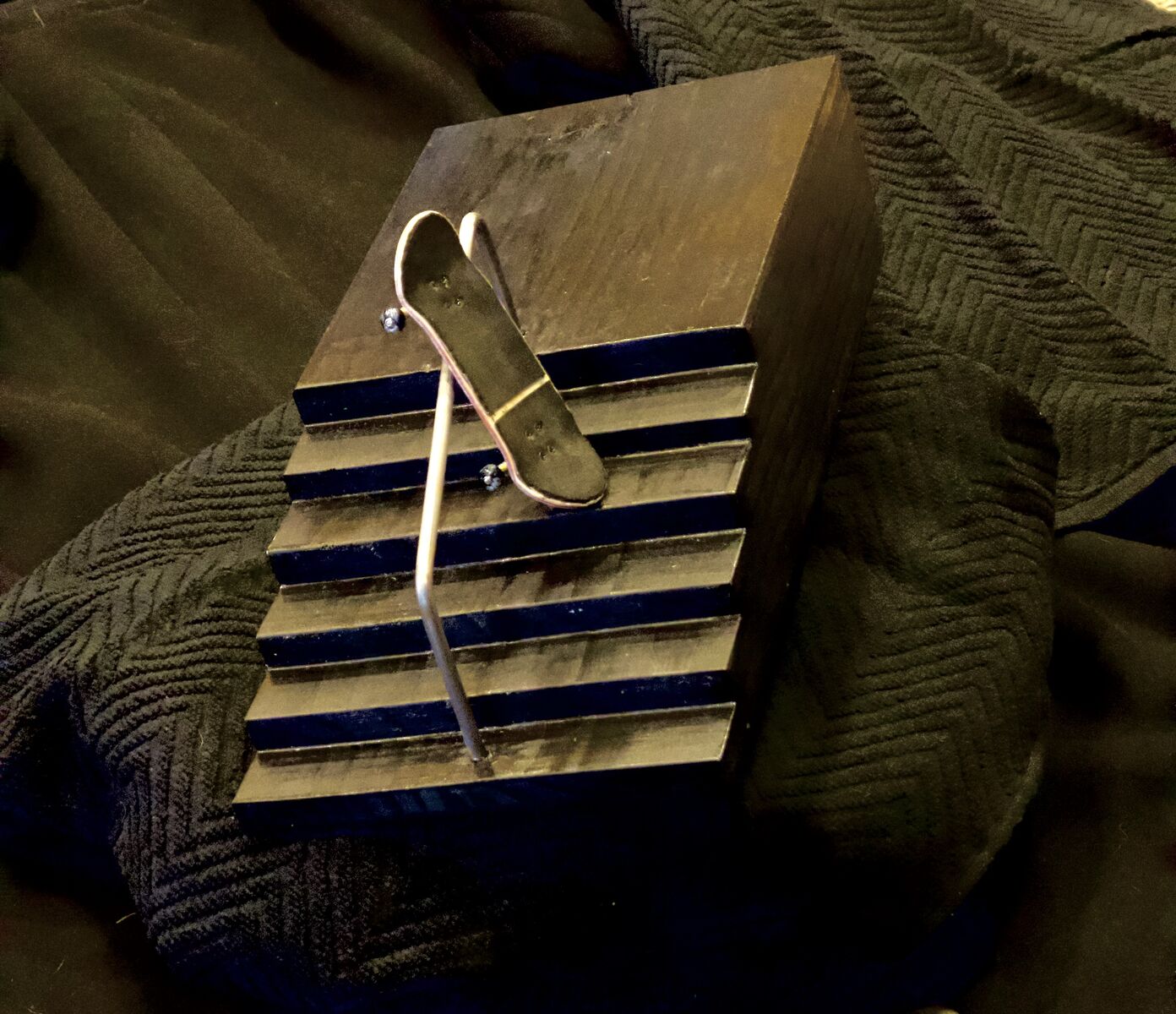 Venmo6 stair obstacle with grind rail. Hand built, textured and stained. Solid wood. With the weight of the solid wood and the felt pads, they are extremely solid and stay in place well.