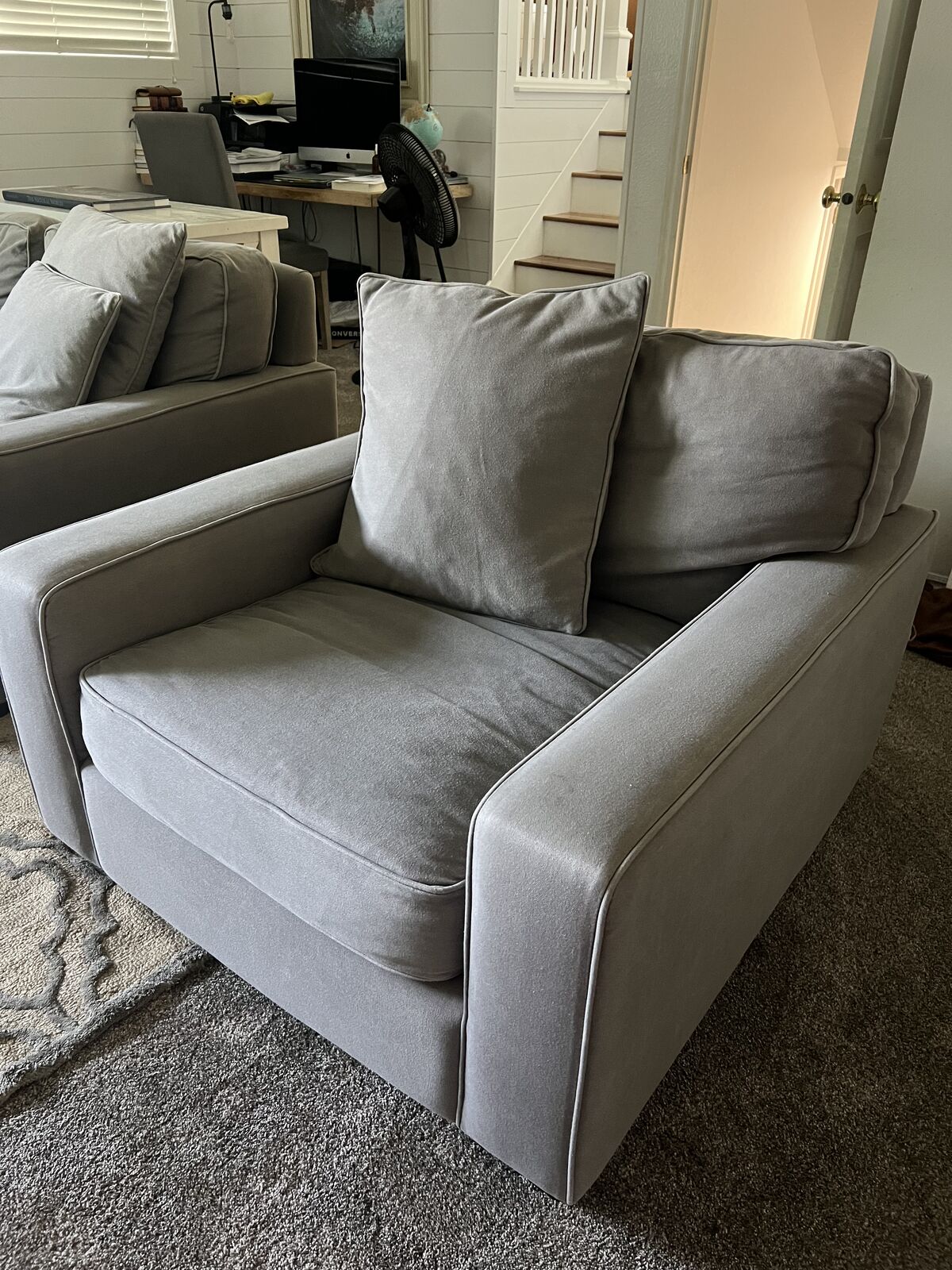 Moving. Big, comfy feather filled sofa and chair in good condition. Downeast home brand. One owner.