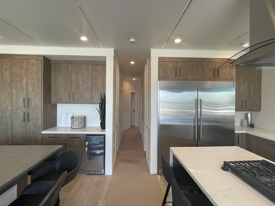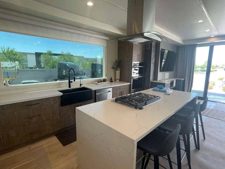 Galley & Interior: • Quartz countertops in galley and bathrooms • Full-size stainless steel range and oven • Full-size 30" stainless steel refrigerator and 30" freezer (in galley) • Commercial-grade icemaker (galley) • Microwave and dishwasher • Washer/dryer combo • Custom-designed interior with complete furnishings