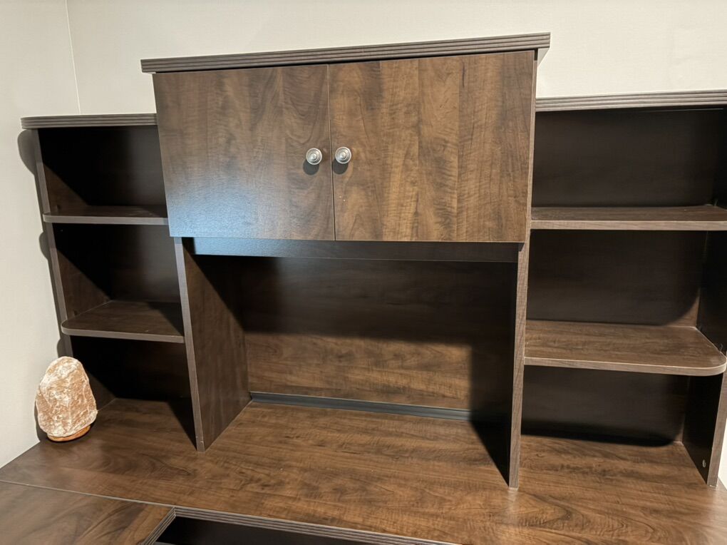 3 drawers, with the top locking. Overhead cabinet and 6 shelves.