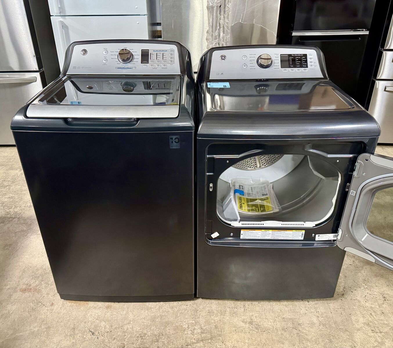 Like new, GE set is sold with a 13 month parts and labor warranty.
