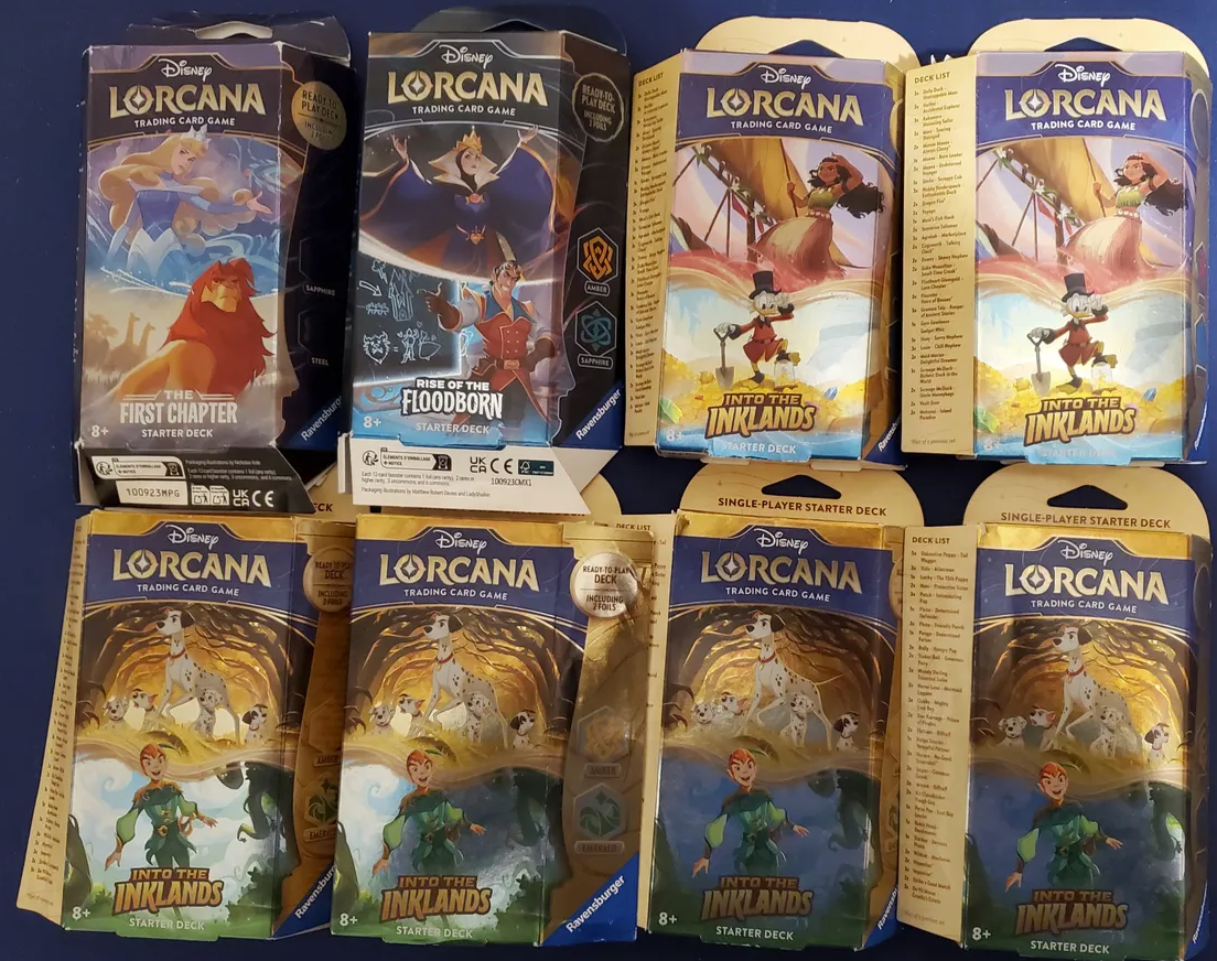 The pictured Booster Packs and Starter Boxes are empty (except for the ad cards) as the cards collected from those are in the larger cardboard shoe box housing most of the collection organized by color and chapter. I also custom built at least 13 decks (separated out in the Trove box for easy access). There is also a complete Lorcana Gateway set included with the original board and contents.