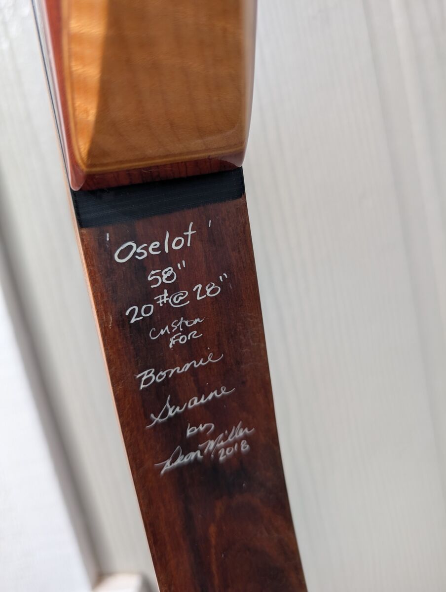 The bow has been signed and personalized by the bowyer Dean Miller with Cougar Ridge Custom Bows.