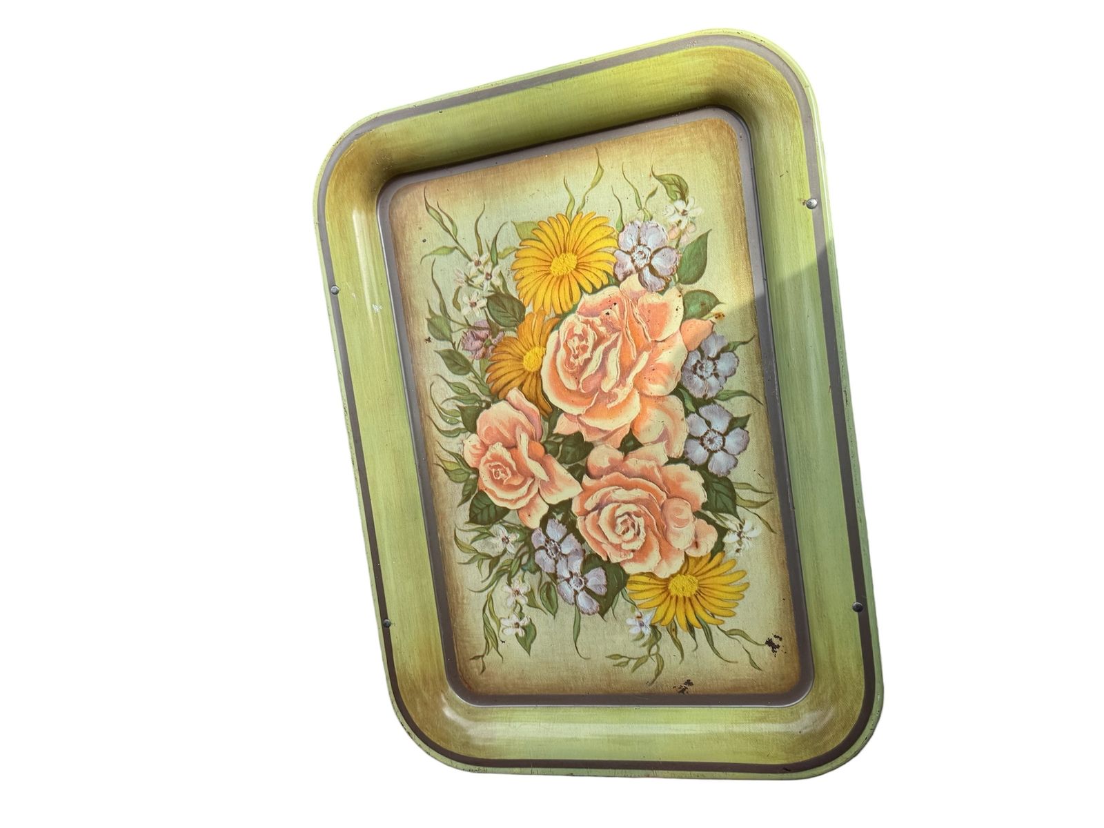 VenmoThis item is a vintage metal mid-century modern metal serving tray with stand featuring a floral design with pink roses and yellow daisies. Tray is recessed with a 1” lip